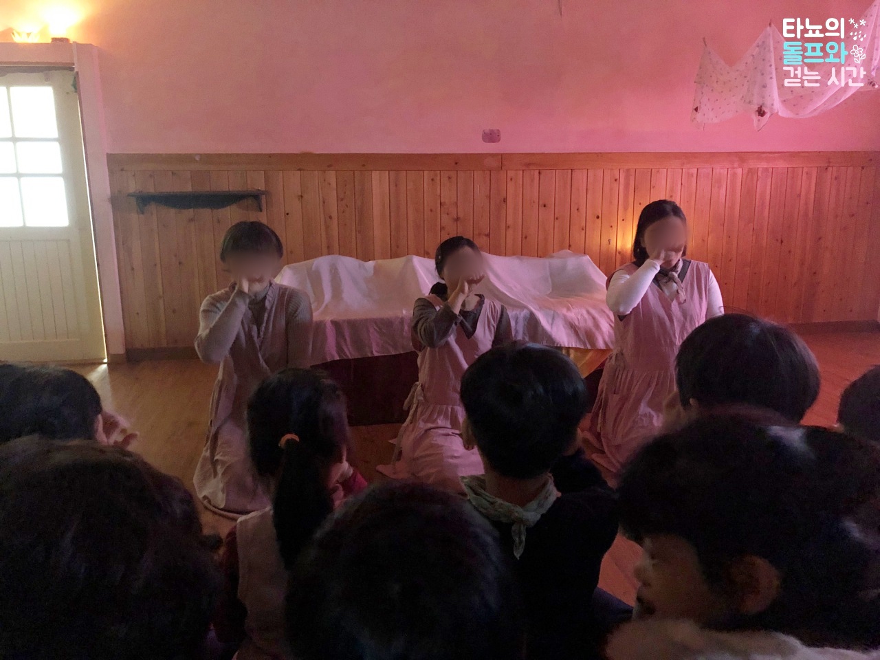 ▲ 간단한 식사 후에는 모든 아이들이 작은 강당(교실)에서 모여서 선생님들이 준비하신 인형극을 봤습니다. 선생님들은 불이 꺼진 캄캄한 공간에서 아주 조용한 소리로 인형극을 진행했는데, 신기한 것은 우리가 소리를 고래고래 지르면서 말을 들어라고 할 때는 본 척도 하지 않던 아이들이 선생님들의 다 죽어가는 작은 소리에도 집중을 하고 잘 따른다는 것이었어요. 비결이 뭘까요. 저희가 배워야 할 부분이겠죠.