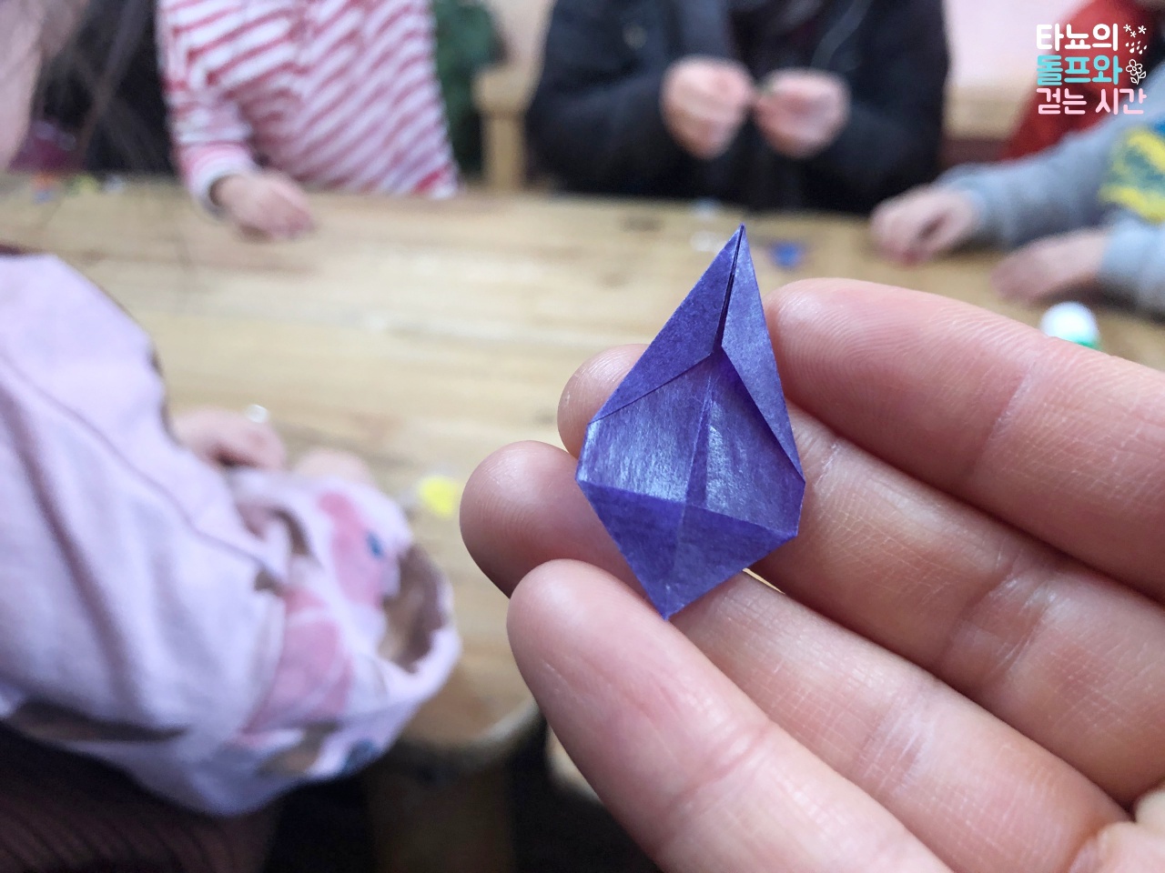▲ 둘째 조카녀석이 고사리 같은 작은 손으로 꼼지락 거리며 종이접기를 하고 있습니다. 오른쪽 보라색은 제가 접어봤는데요. 동지 축제에 참석을 하니 이런 걸 만들라고 주시더라고요. 8가지 색상의 아주 작은 종이였는데 아이 1명에 한 세트씩 준비해주셨어요.