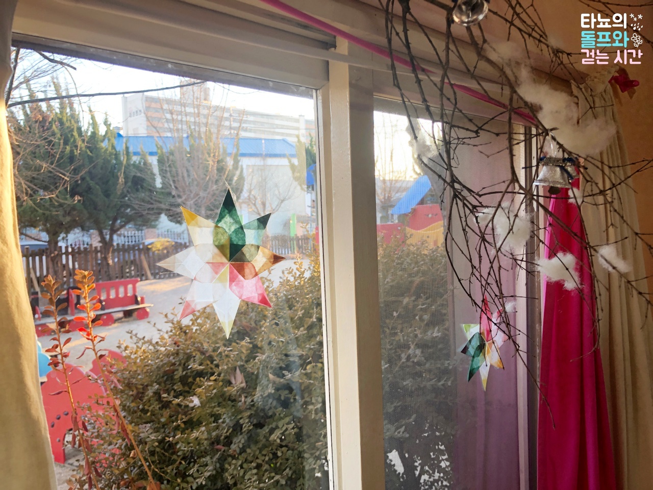 ▲ 다른 사람들도 하나씩 별을 붙이기 시작했어요. 어린이집 건물 안에도 여기저기 많은 장식들이 있었는데 하나도 빠짐없이 모두 자연에서 가져온 장식들이었어요. 커튼도 모두 순면으로 만들어진 것 같았고요. 봉이 아닌 끈을 달아서 걸쳐놓은 커튼이 부실해 보이면서도 뭔가 따뜻해 보였어요. 괜히 마음이 따뜻해지는 그런 거요.
