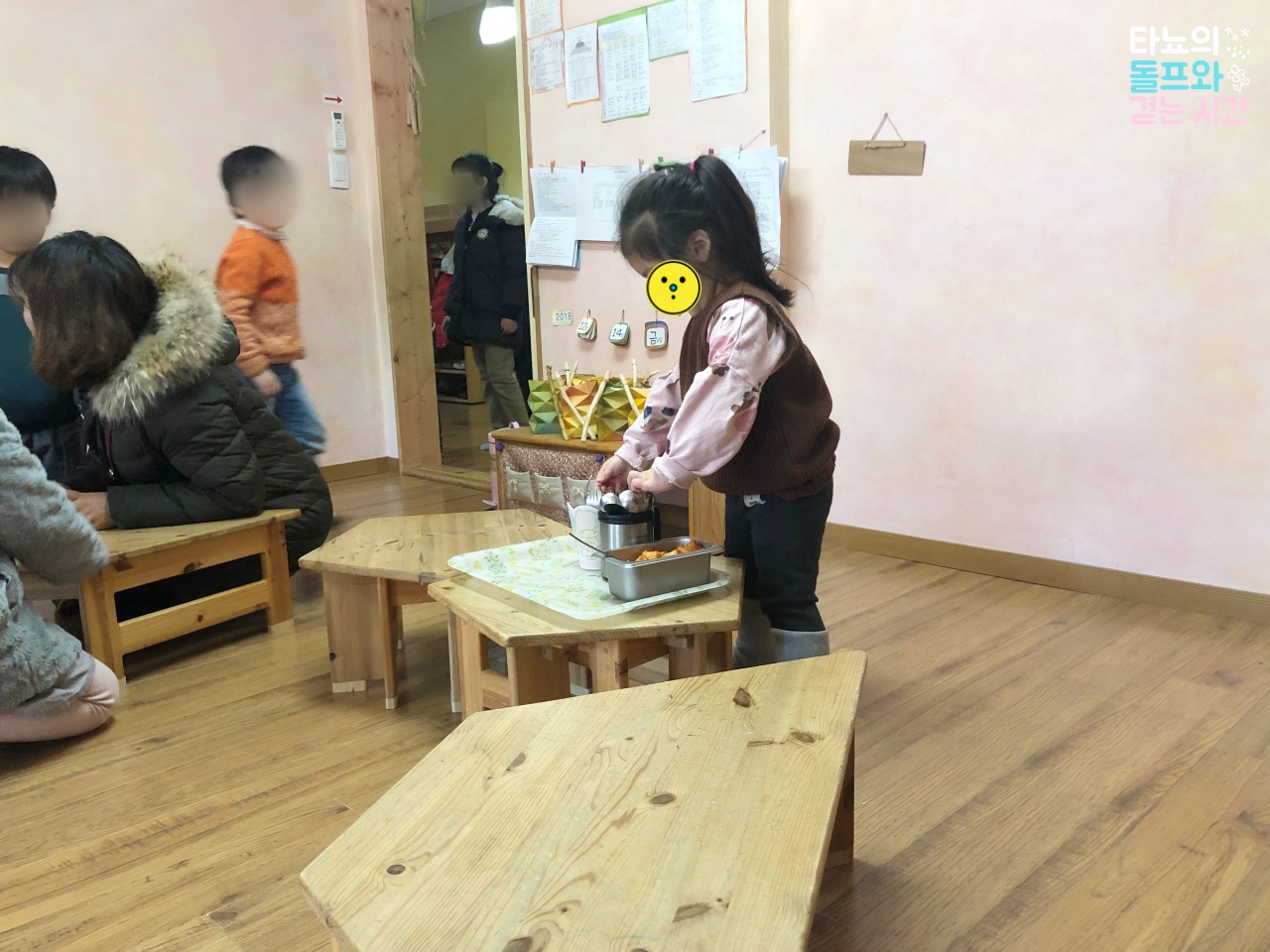 ▲ 종이별을 다 만든 아이들과 부모들은 옆방으로 이동해서 간단한 간식을 먹었어요. 우리 둘째가 이모와 엄마를 위해서 깍두기를 열심히 담고 있습니다. 숟가락과 포크도 함께 가져오라고 시켰더니 아주 잘 해냈어요.