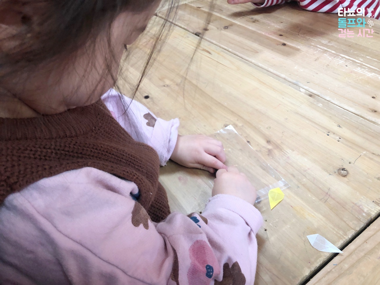 ▲ 둘째 조카녀석이 고사리 같은 작은 손으로 꼼지락 거리며 종이접기를 하고 있습니다. 오른쪽 보라색은 제가 접어봤는데요. 동지 축제에 참석을 하니 이런 걸 만들라고 주시더라고요. 8가지 색상의 아주 작은 종이였는데 아이 1명에 한 세트씩 준비해주셨어요.
