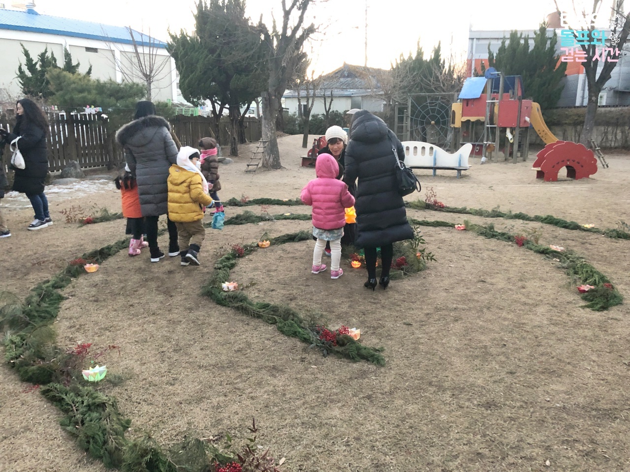 동글동글한 장식을 지나 중앙으로 가니 원장 선생님께서 [ 올 한해 참 건강하게 잘 자라줘서, 지내줘서 너무 고맙다. 새해에도 더 건강하고 예쁘게 잘 자라야 해 ]라는 내용의 덕담과 축복을 해주시며 등불에 불을 밝혀 주셨어요. 아이들이 뭘 알까요. 그저 불을 밝혀주는 모습이 참 예쁘고 신기했을 것 같아요. 뭔가.. 이 모든 것이 아까 봤던 인형극과 이어지는 것 같아서 더 따뜻하게 느껴졌어요.