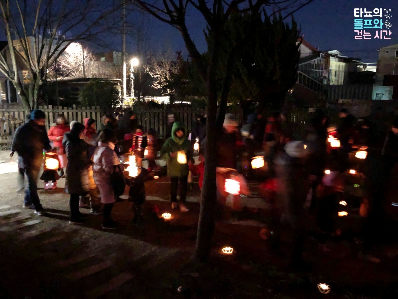 ▲ 인형극이 끝나자 모두 함께 밖으로 나갔습니다. 동글동글한 마당 장식 중앙에 원장 선생님이 서 계셨는데 아이들은 한 명씩 부모의 손을 잡고 한 손에는 등불을 들고 원장 선생님께로 나아갔어요.