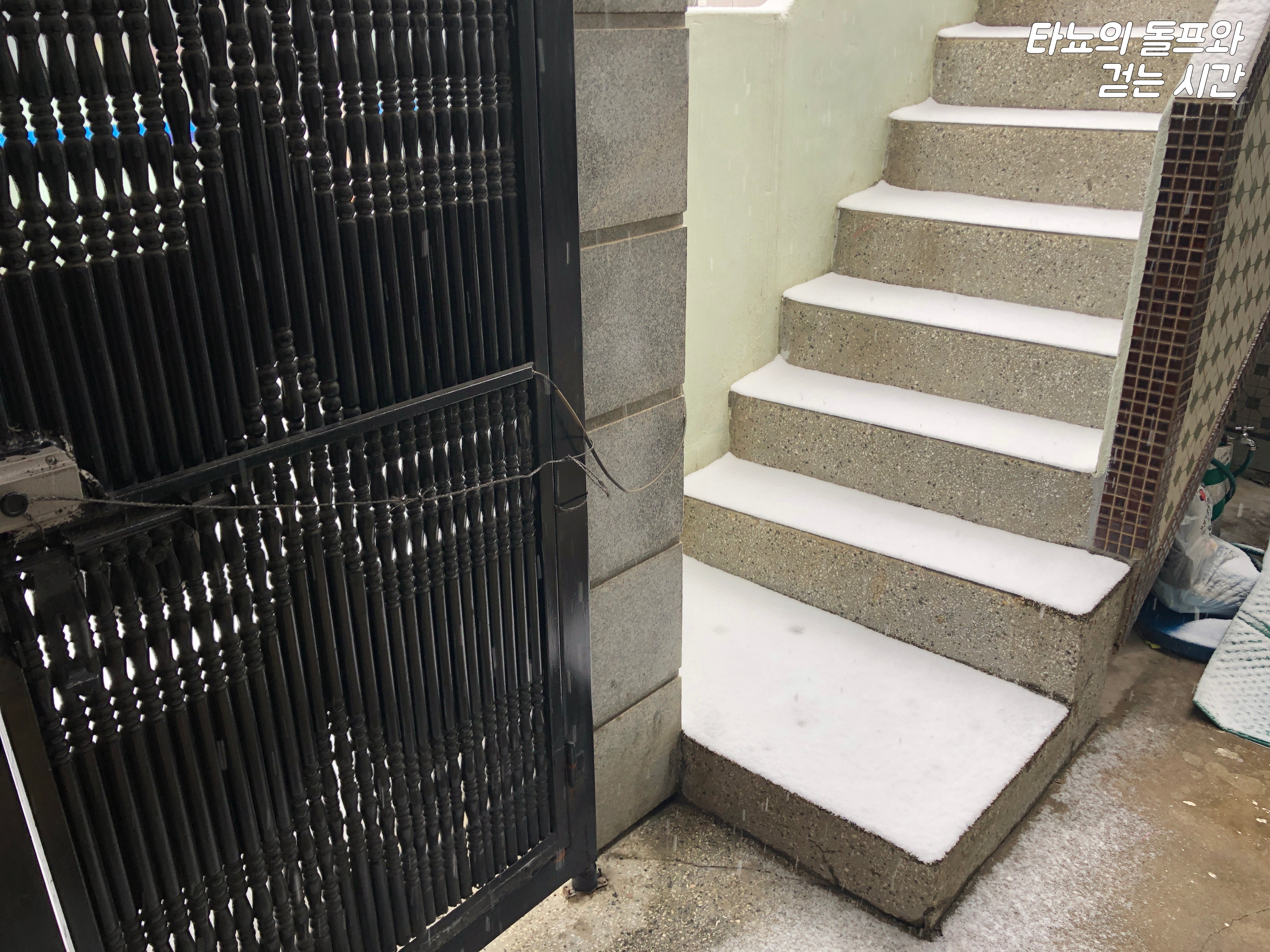 ▲ 친정에 갔다가 외출을 하려고 나서니 2층으로 가는 계단에 눈이 소복하게 쌓였더라고요.