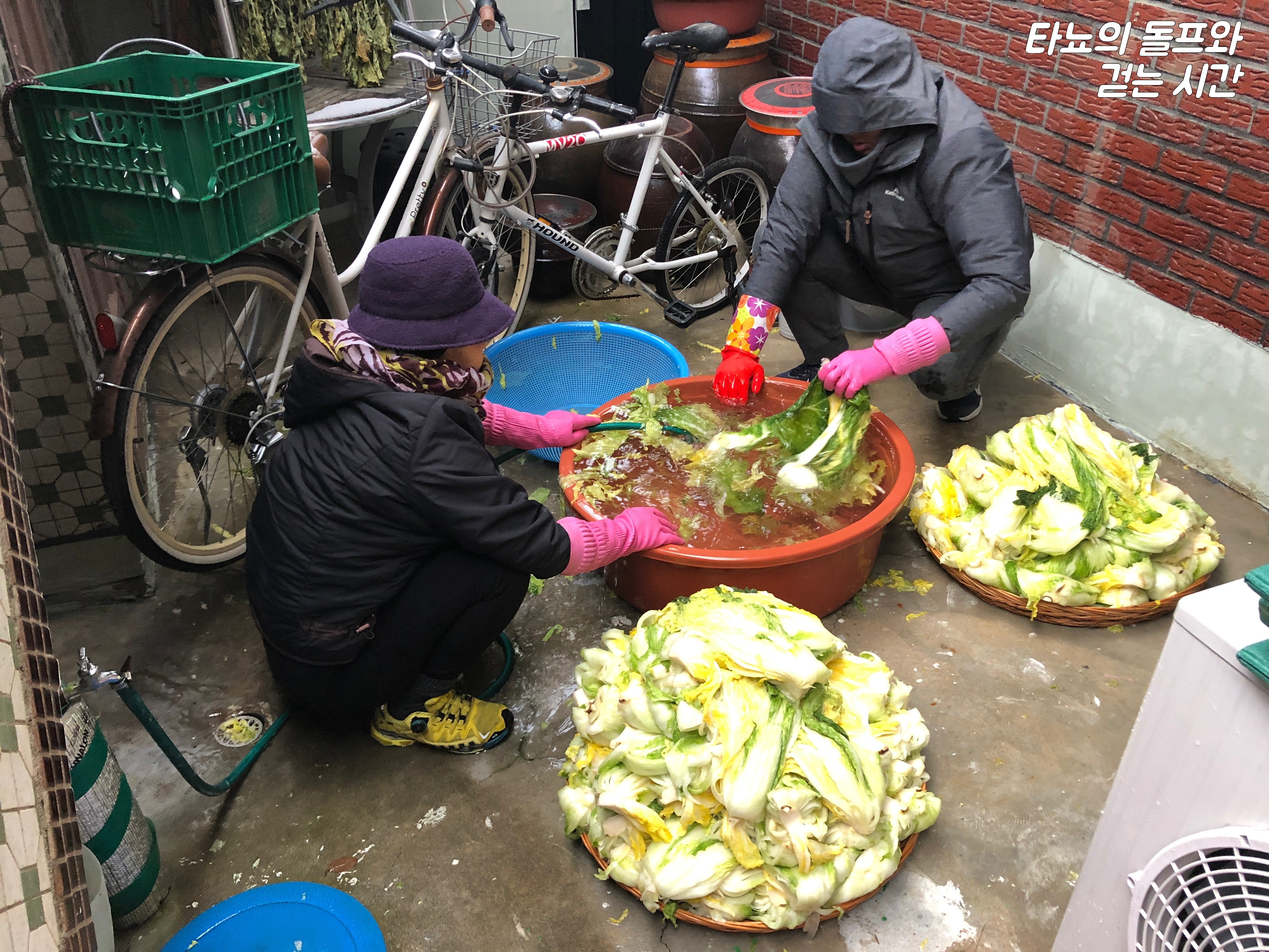 ▲ 절인 배추 헹구는 것을 신랑이 돕고 있어요. 이 날 함박눈이 내렸지만 저희는 굉장히 바빴답니다. 엄마 친구분께서 배추 농사를 지으시는데 아직까지 밭에 팔리지 않은 배추가 많다고 하셨어요. 엄마는 친구의 어려움을 그냥 넘기지 못하셨고 친구분 밭에 남아 있던 많은 배추를 구입하셨어요. 그리고 저희는 김장을 했답니다. 사실 김장은 진작에 하셨다고 했는데 어쩌다 보니 두 번째 김장을 하게 된 거죠.