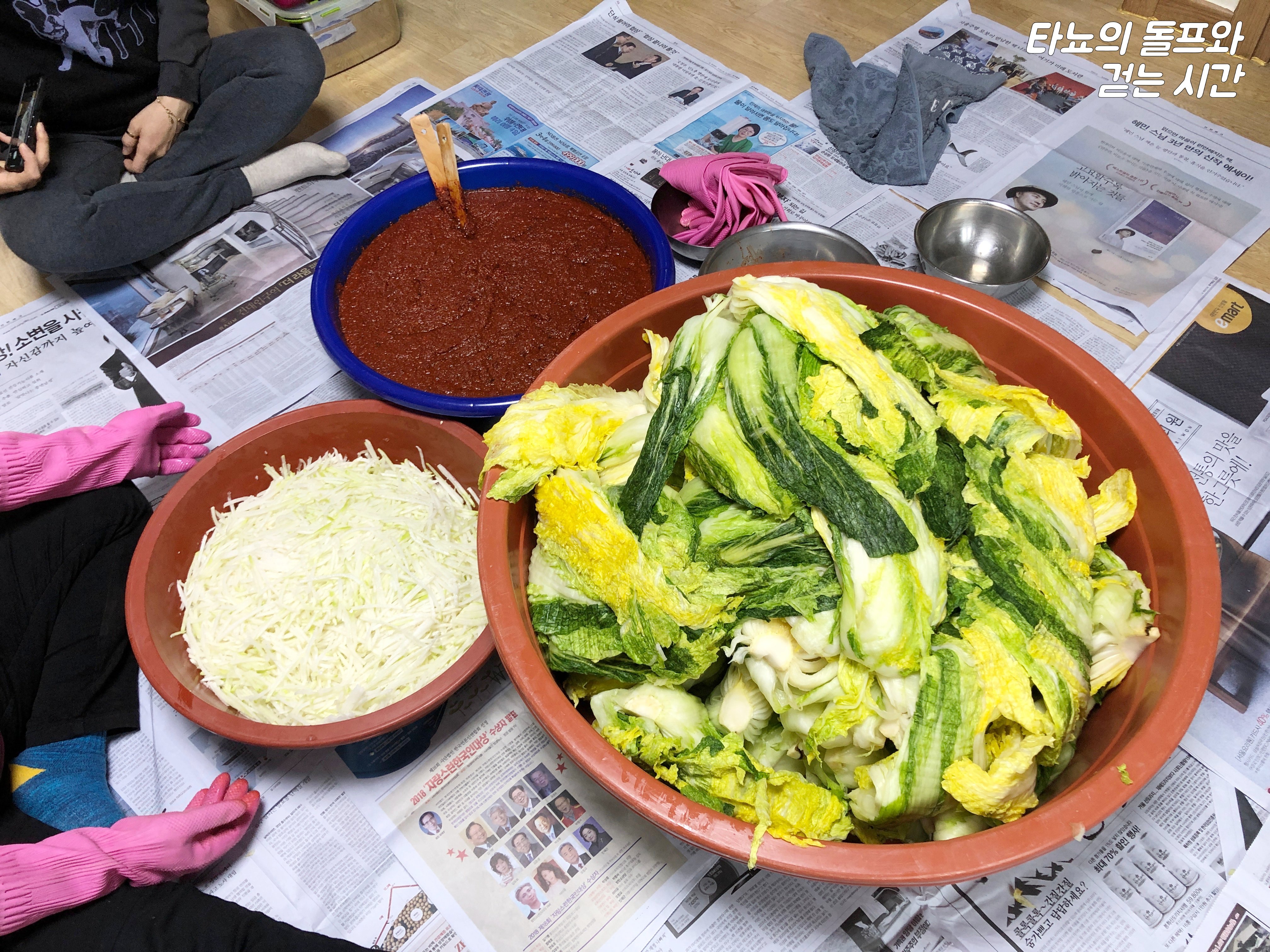 ▲ 신문지를 꼼꼼하게 깔고 숙성시킨 양념과 배추, 무도 채썰어서 준비했어요. 엄마와 언니, 저희 부부가 둘러 앉아 열심히 김장을 했지요.