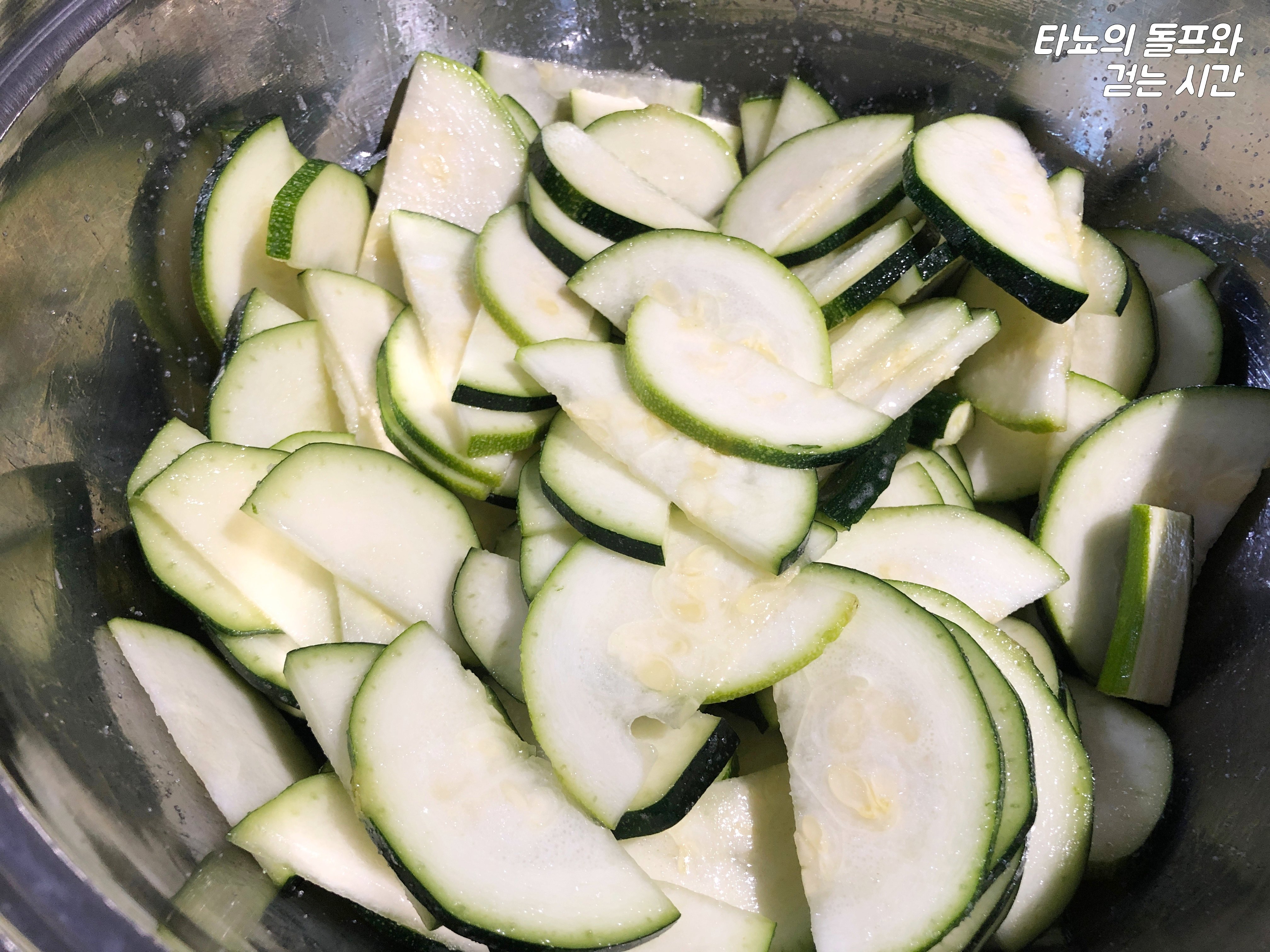 맛소금 1큰술 솔솔 뿌려서 잘 섞어줬어요. 15분 이상 두니 호박에서 물이 많이 나왔어요. 이렇게 미리 소금에 절여서 사용하게 되면 밑간도 잘 맞춰지고 무엇보다 호박을 볶아도 잘 부서지지 않아요. 먹을 때 씹는 식감도 훨씬 좋고요.