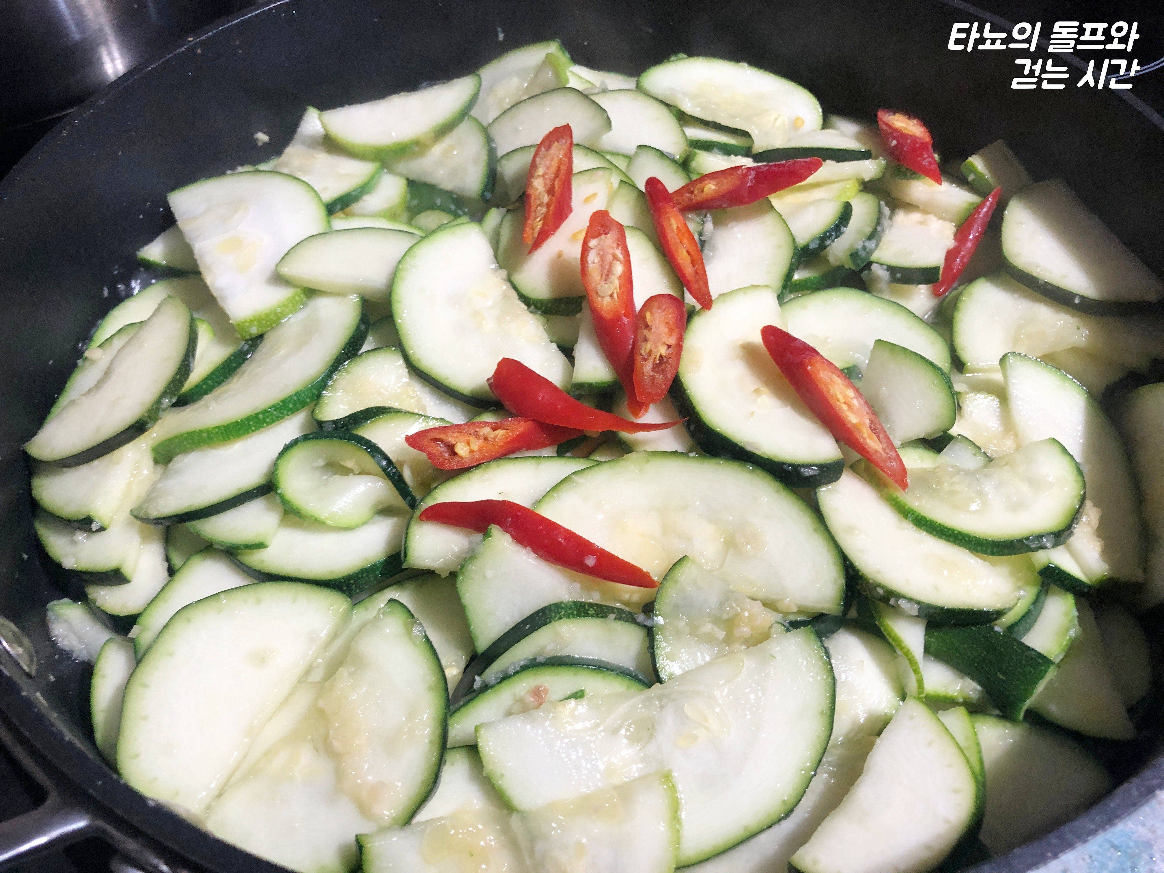▲ 뜨거워진 팬에 기름을 넉넉하게 두르고 절인 호박, 다진 마늘, 홍고추를 함께 넣어주세요. 이때 호박에서 나온 물은 함께 넣지 마세요. 저는 마늘 냄새에 민감하지 않아서 모든 재료를 함께 넣어서 볶는 편인데 예민하신 분들은 기름에 다진 마늘을 먼저 살짝 볶고 나머지 재료를 넣으시면 될 것 같아요.