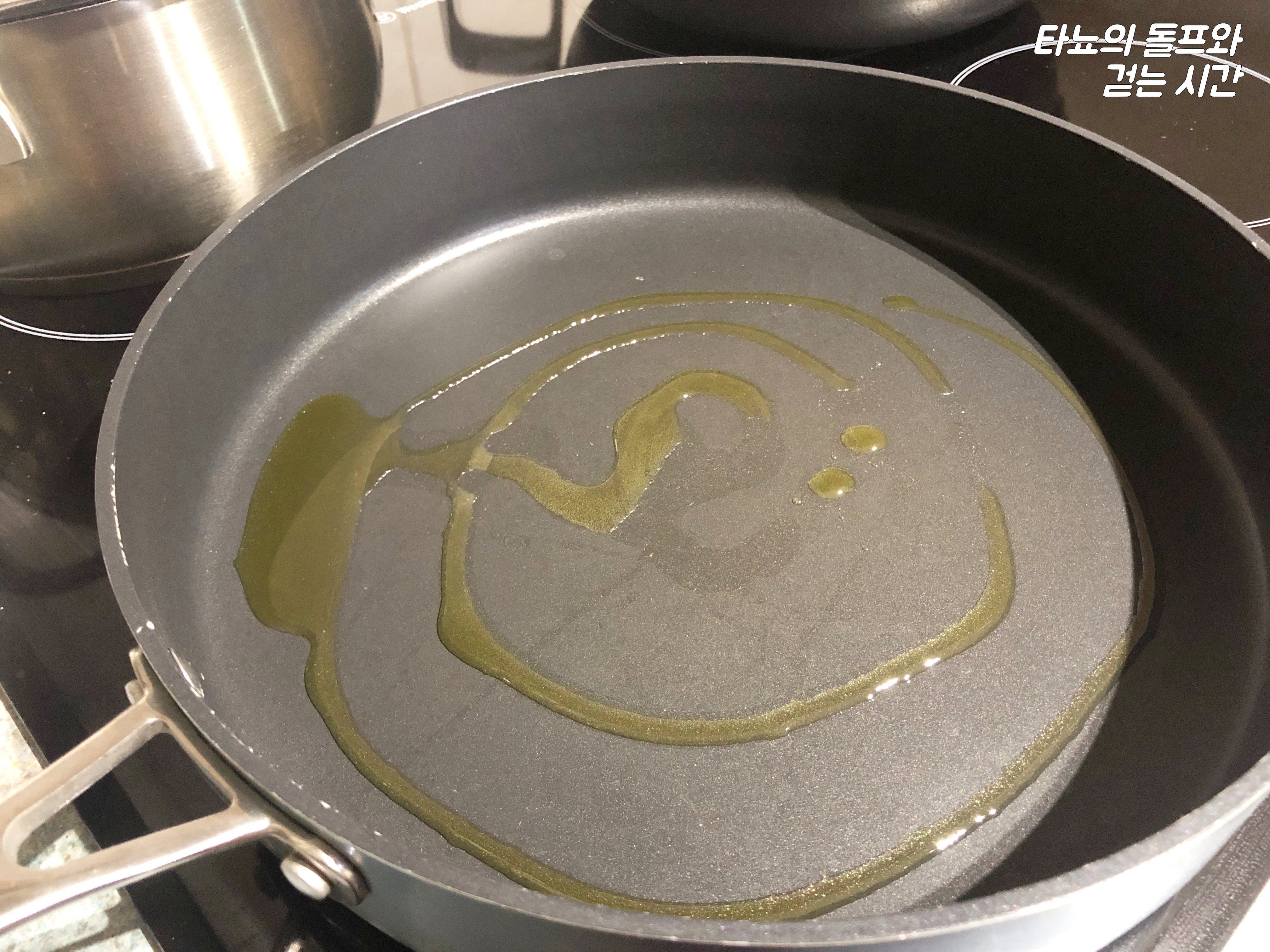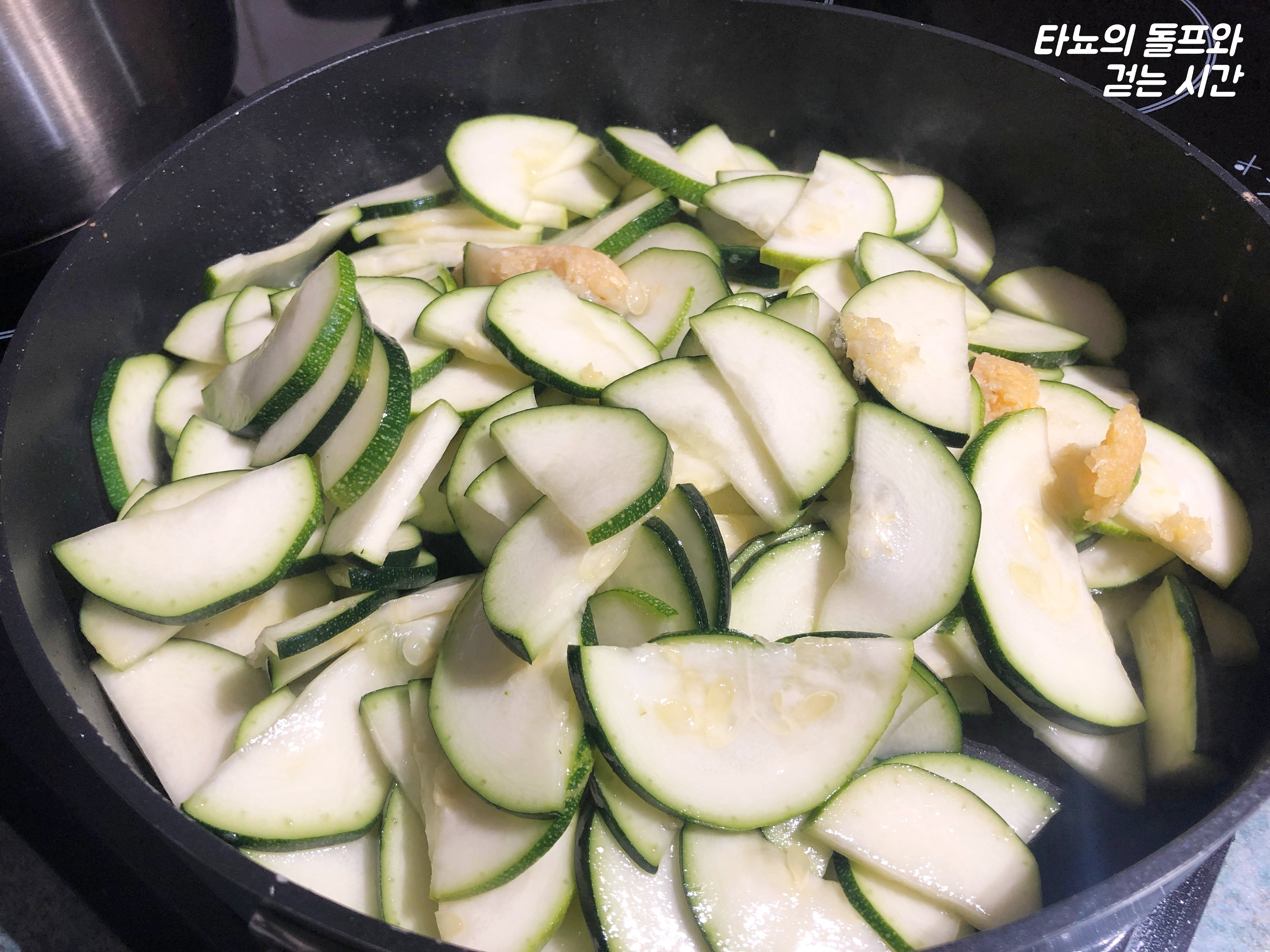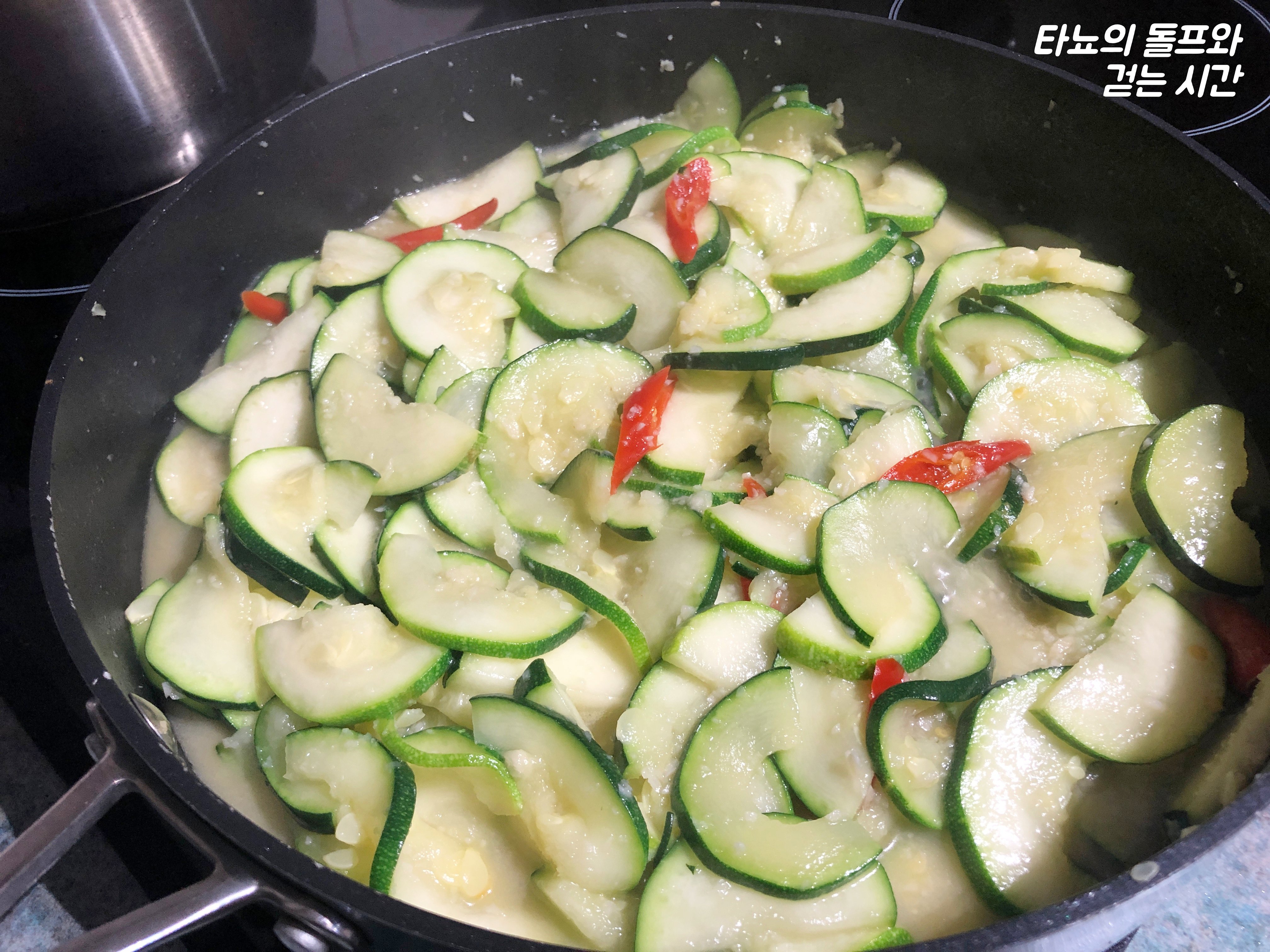 ▲ 뜨거워진 팬에 기름을 넉넉하게 두르고 절인 호박, 다진 마늘, 홍고추를 함께 넣어주세요. 이때 호박에서 나온 물은 함께 넣지 마세요. 저는 마늘 냄새에 민감하지 않아서 모든 재료를 함께 넣어서 볶는 편인데 예민하신 분들은 기름에 다진 마늘을 먼저 살짝 볶고 나머지 재료를 넣으시면 될 것 같아요.