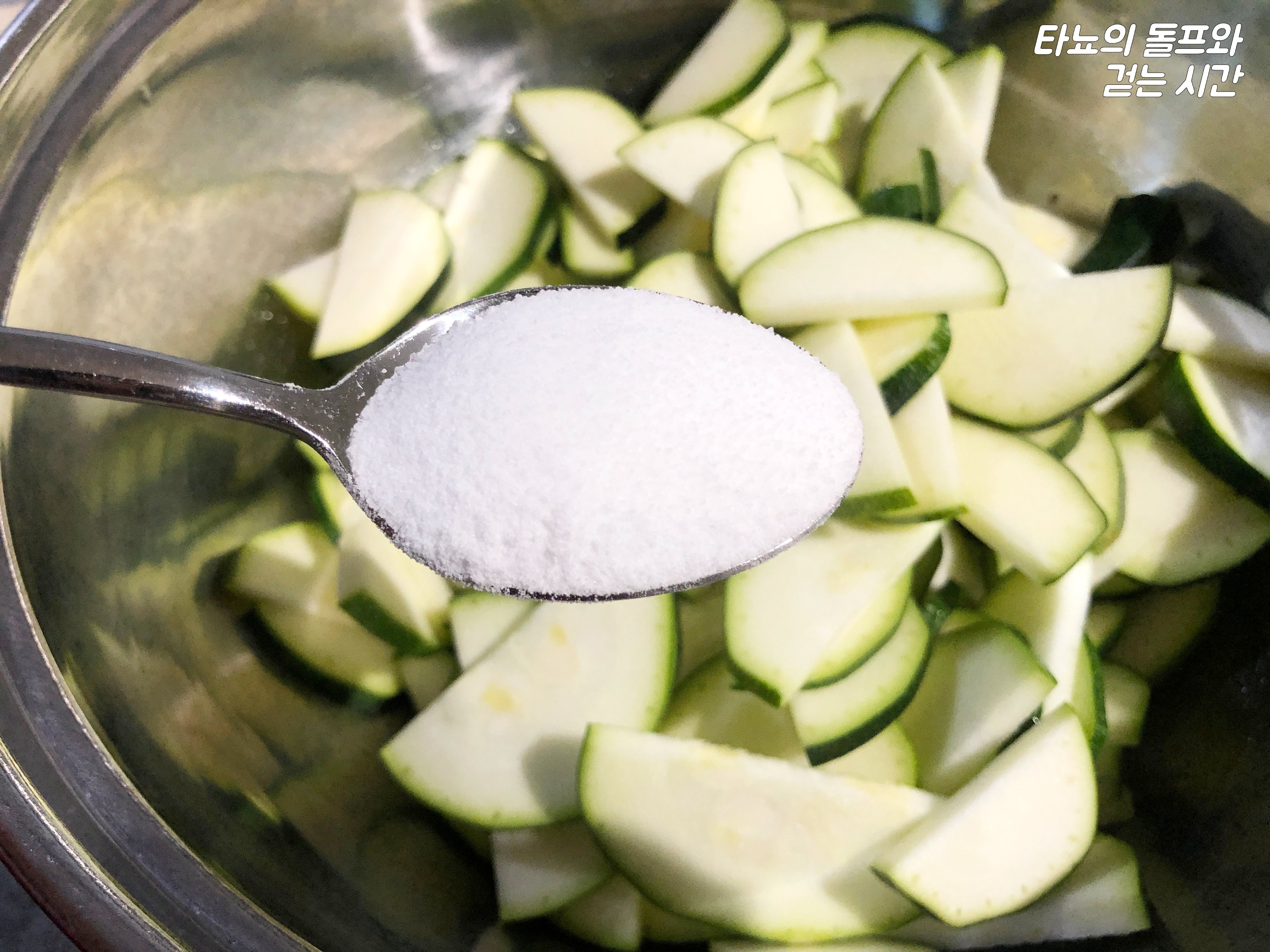 맛소금 1큰술 솔솔 뿌려서 잘 섞어줬어요. 15분 이상 두니 호박에서 물이 많이 나왔어요. 이렇게 미리 소금에 절여서 사용하게 되면 밑간도 잘 맞춰지고 무엇보다 호박을 볶아도 잘 부서지지 않아요. 먹을 때 씹는 식감도 훨씬 좋고요.