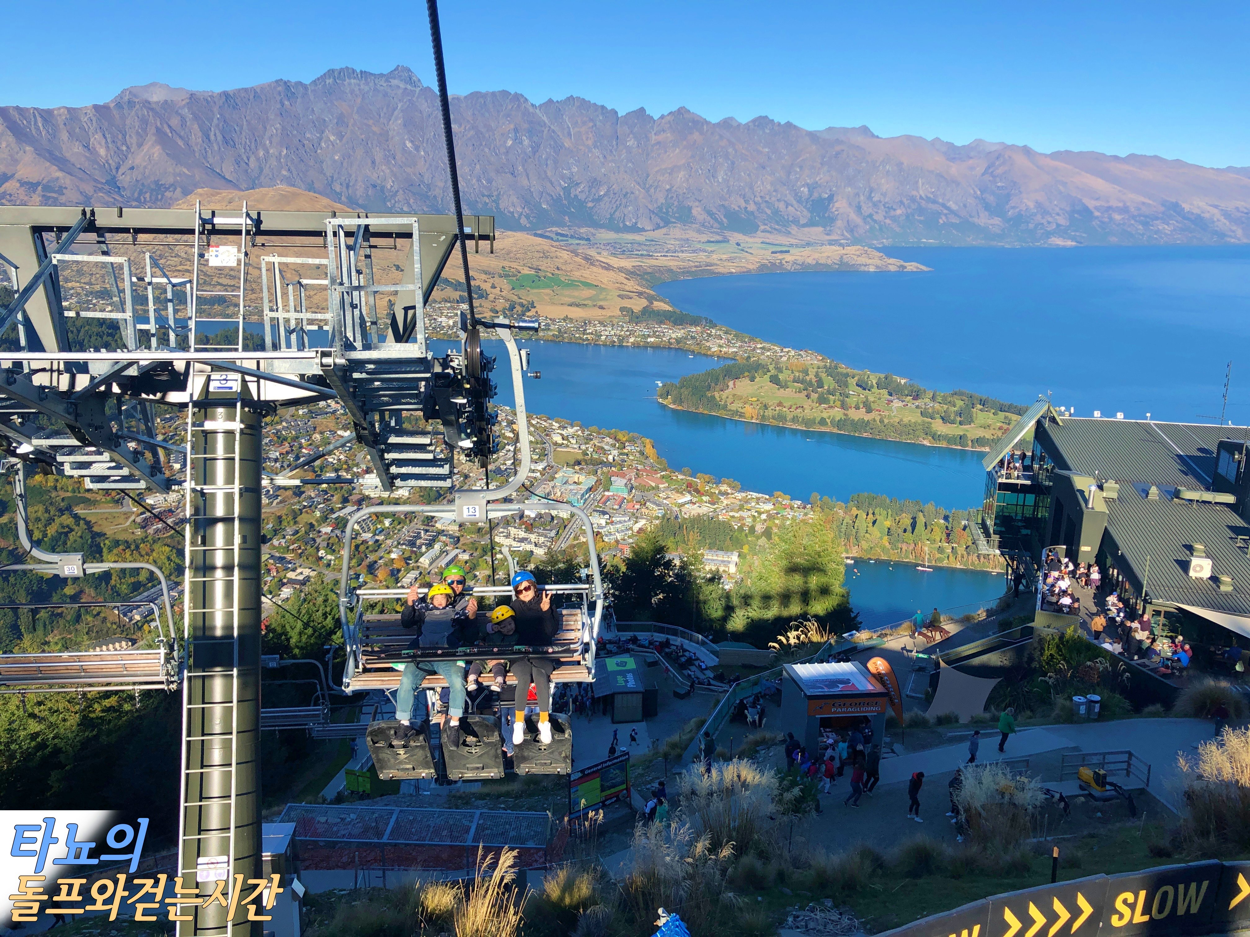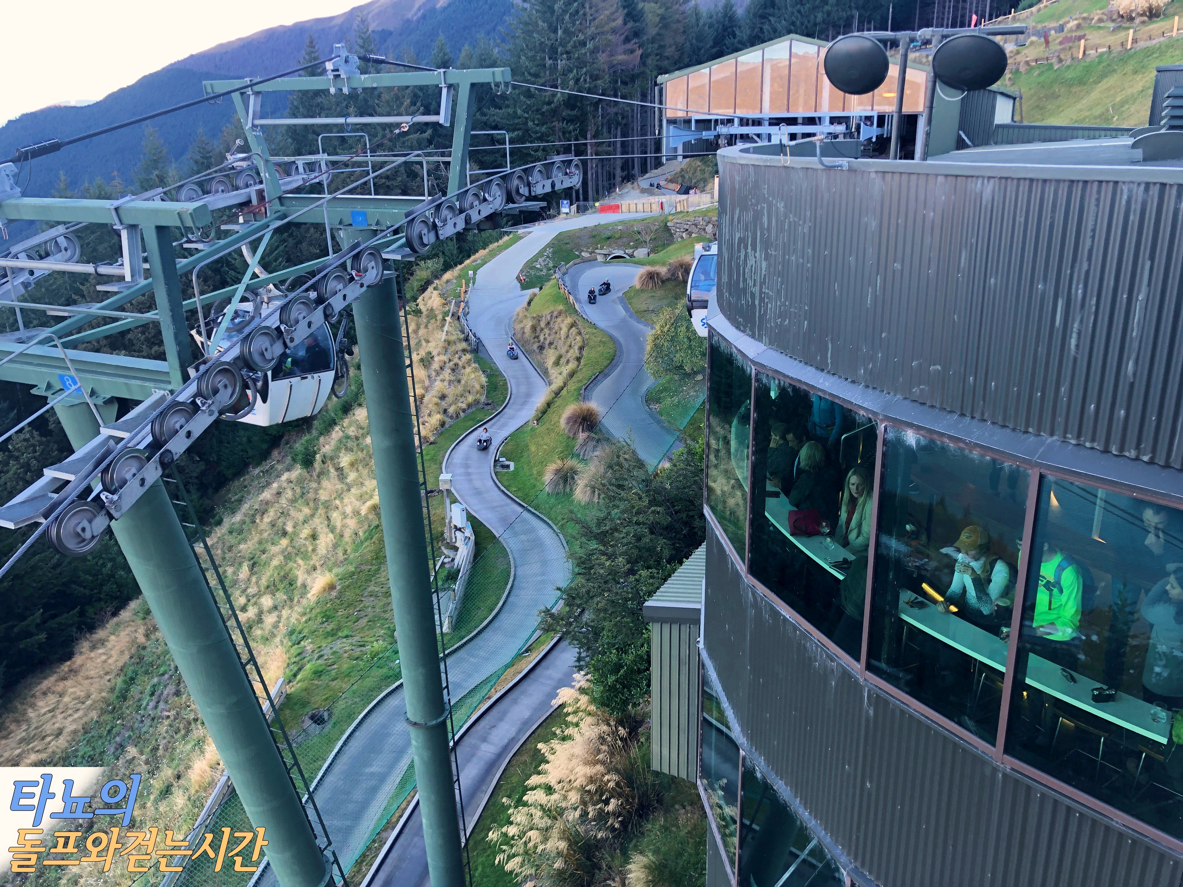 곤돌라를 타고 올라온 뒤 레스토랑과 기념품샵을 지나 위로 올라가다보면 루지를 타는 곳이 나옵니다. 루지 티켓 발권하는 곳도 레스토랑을 지날 때쯤 눈에 띄는 곳에 위치했으니 발권 걱정은 할 필요가 없답니다. 점점 돈을 더 벌겠다는 심산인지, 작년에 없었던 시스템들이 많이 생겼더라고요. 위 사진에 보이는 샷을 찍어주고 인화해서 비싼 값에 팔고 있었는데 저희는 저희끼리 직접 휴대폰으로 찍었습니다. 햇살이 잘 들어온 퀸스타운과 와카티푸 호수의 모습은 참 아름답습니다. 정말 그림 같은 배경이죠?