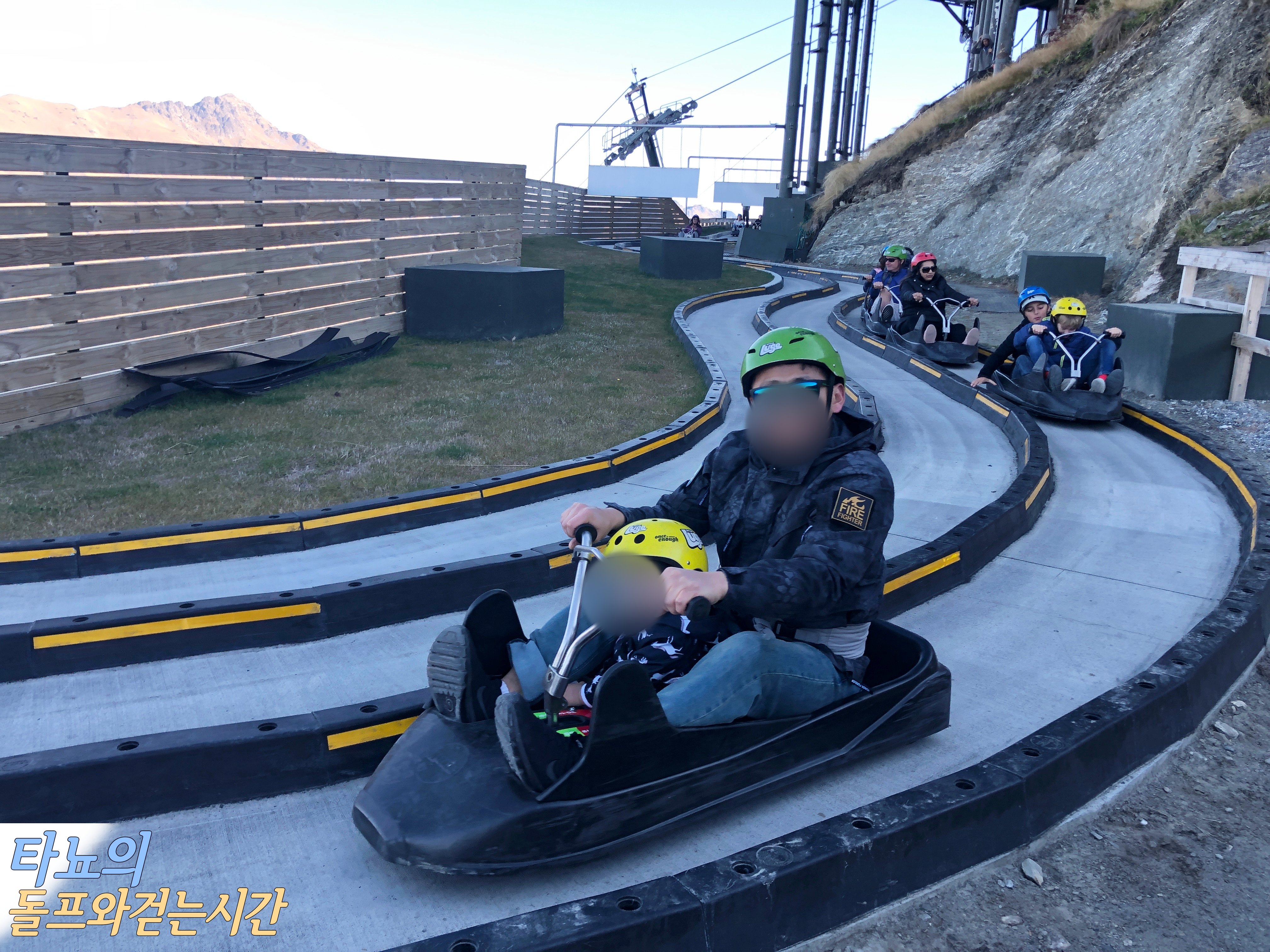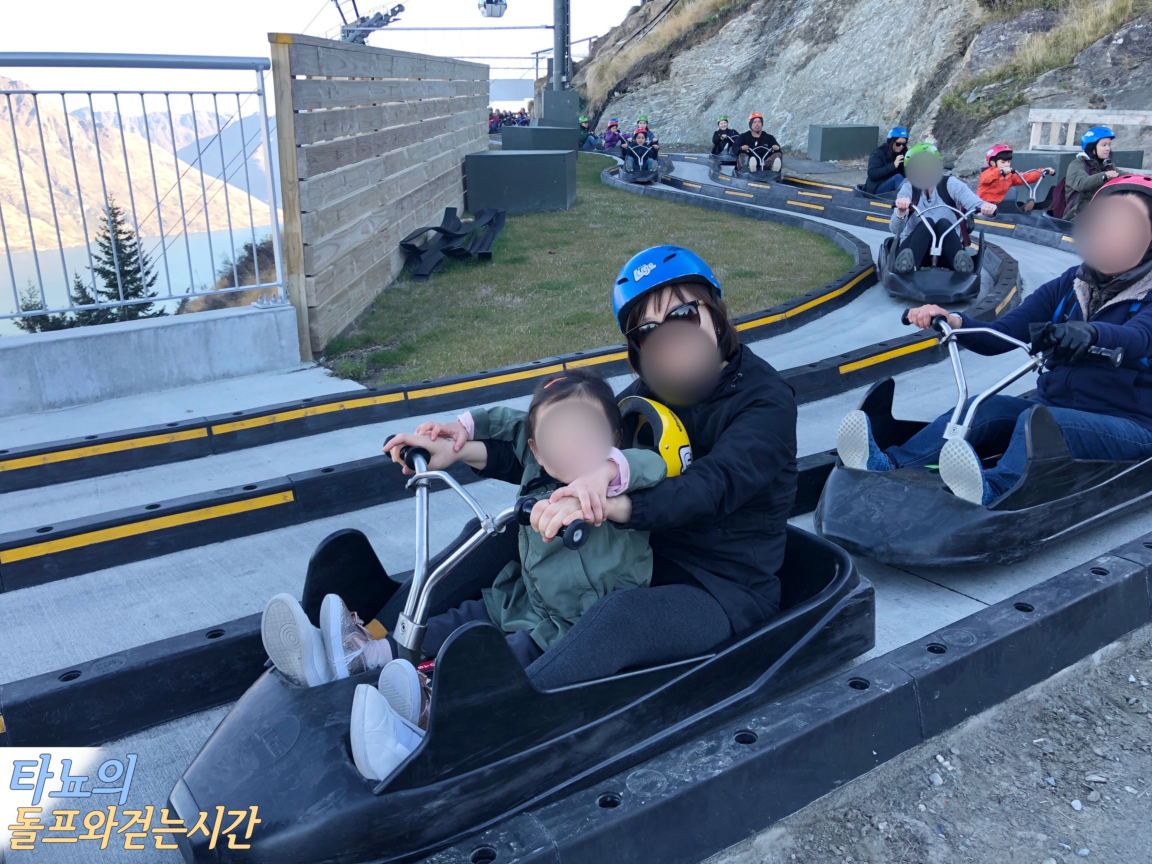 오빠와 새언니가 각각 한 아이씩 맡아 함께 타고 내려왔습니다. 저희는 총 3번 탈 수 있는 티켓을 끊었는데 마지막으로 탈 때는 오빠와 새언니가 난이도가 높은 코스로 갈 수 있도록 조카들을 저희 부부가 안고 탔답니다. 퀸스타운 루지의 코스는 2개가 있는데 하나는 초보자 코스, 하나는 숙련자 코스입니다. 숙련자 코스는 확실히 조금 더 스릴 있고 아찔하며 높은 경사와 급커브가 꽤 많답니다. 그래도 위험하지 않을 만큼 재밌으니 걱정할 필요는 없습니다.