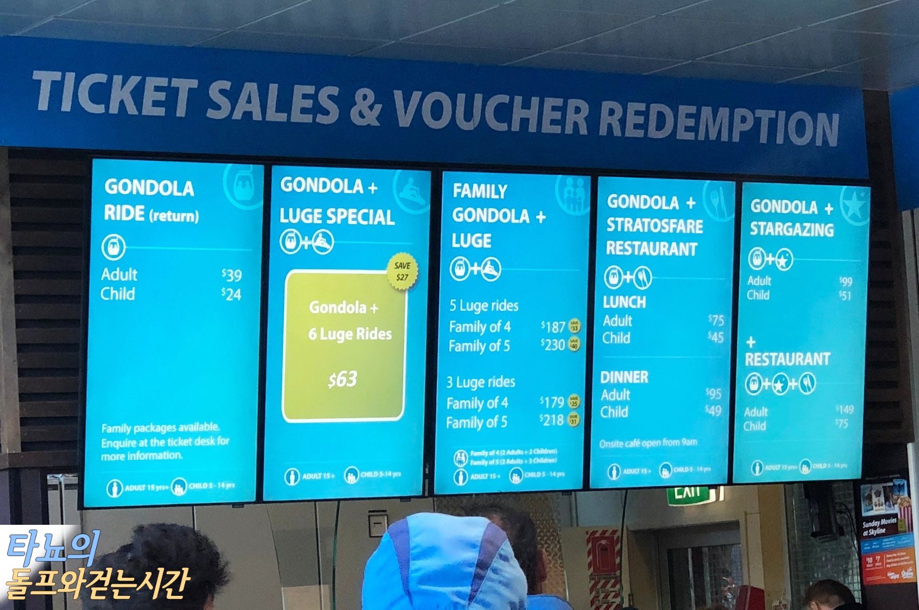 곤돌라를 타기 전에는 꼭 티켓을 발권해야하지만 루지 티켓은 위에 가서도 발권이 가능합니다. 1층에서는 곤돌라, 루지, 레스토랑을 포함한 묶음 상품을 판매하고 있었답니다. 저희는 1층에서 곤돌라 티켓을 끊고 올라가서 루지 티켓을 한 번 더 끊었습니다. 성인 4명만 곤돌라 비용을 지불했고 만 1살, 3살인 조카들은 곤돌라 무료로 이용 가능했어요. 다만 루지는 어린이 무료 상품이 아니라서 각각 1번에 2불씩 총 3번에 6불씩 지불했어요.