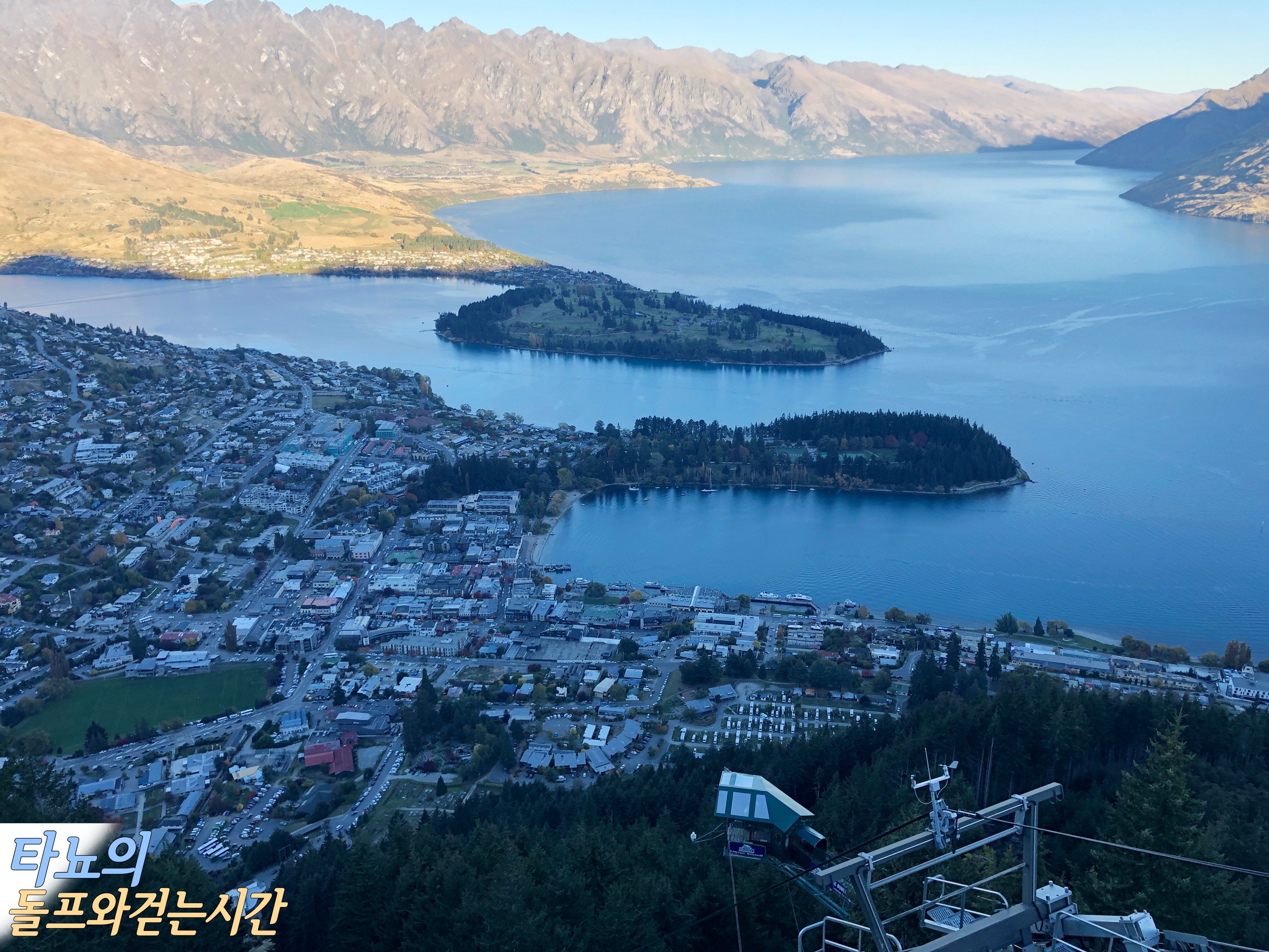 기념품 샵을 지나 건물 끝으로 가면 퀸스타운을 한 눈에 바라볼 수 있는 멋진 전망대가 있습니다. 구름이 햇살을 가려 조금 어둡게 나왔네요. 이 곳에서는 퀸스타운을 둘러싼 높은 산과 마을, 퀸스타운의 메인 거리, 와카티푸 호수 등을 만날 수 있답니다. 아직은 덜 추운지 산 봉우리에 눈이 하나도 없었는데 저 산맥을 따라 눈이 쌓이면 그 또한 장관입니다.