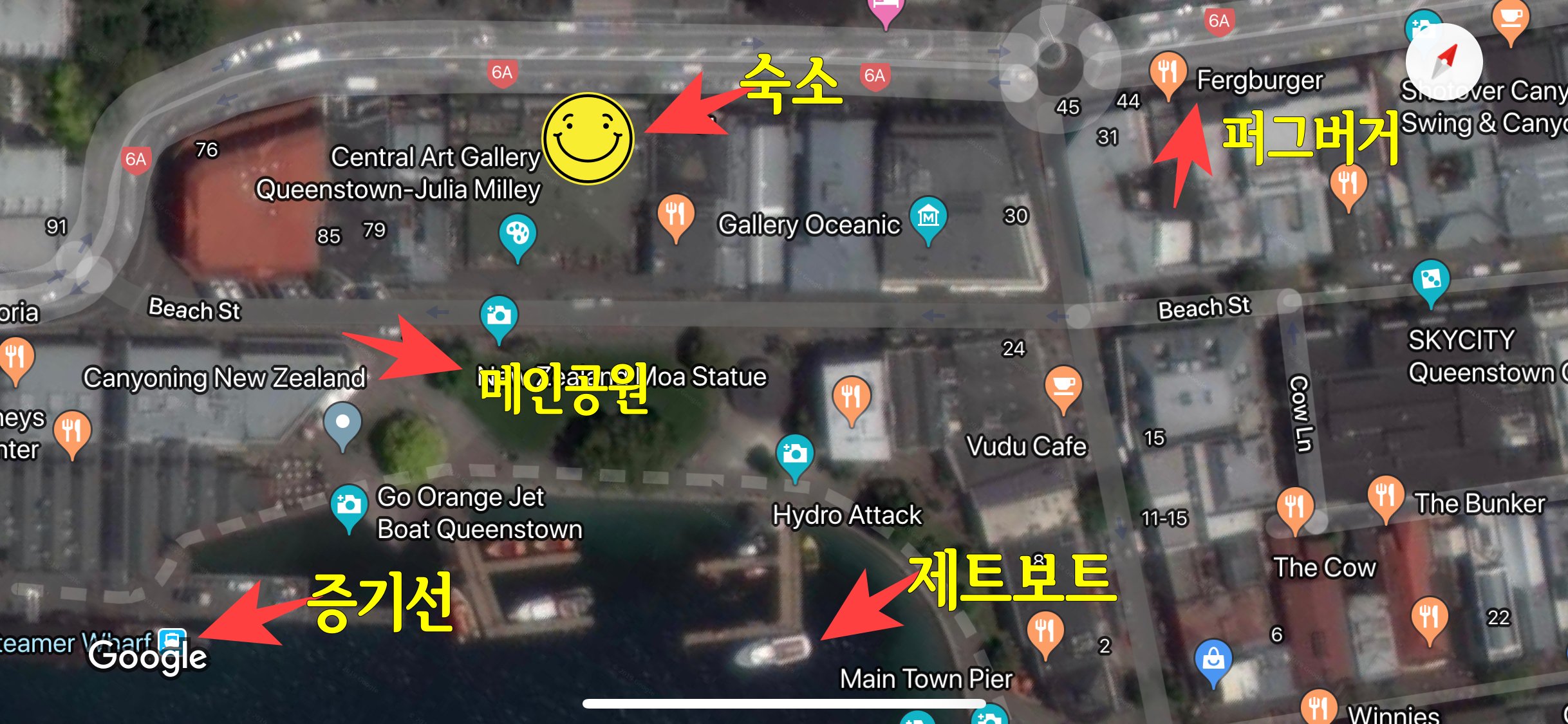 첫 번째 숙소의 위치에요. 퀸스타운 메인 거리에 위치한 덕에 숙소에서 가볍게 걸어서 퀸스타운의 모든 거리를 구경할 수 있었어요. 제트보트와 증기선 타는 곳, 광장, 공원, 공용화장실 등은 모두 숙소에서 1-2분 거리에 있었고 퍼그 버거는 3분 거리 정도에 있었습니다.