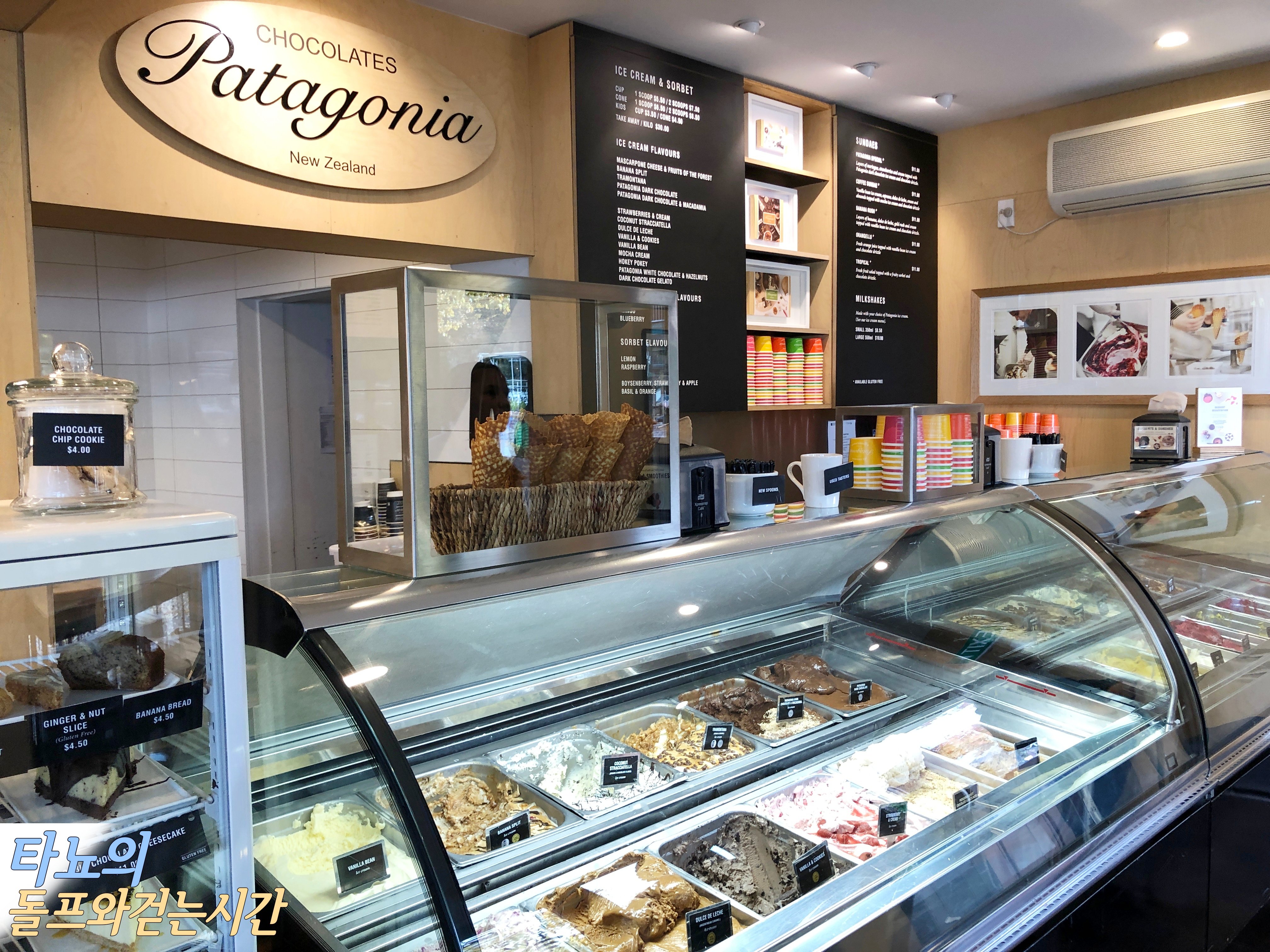루지를 3번씩 타고나니 얼마나 피곤했던지요. 아이들은 순식간에 곯아떨어지고 저희는 입이 심심해서 숙소 앞 '파타고니아(Patagonia)'에 들러서 아이스크림을 구입했습니다. 이 곳은 퀸스타운의 아이스크림 맛집으로 굉장히 유명한 곳인데요. 실제로 먹어보니 맛도 참 좋고 분위기도 서비스도 굉장히 좋았던 것 같습니다.