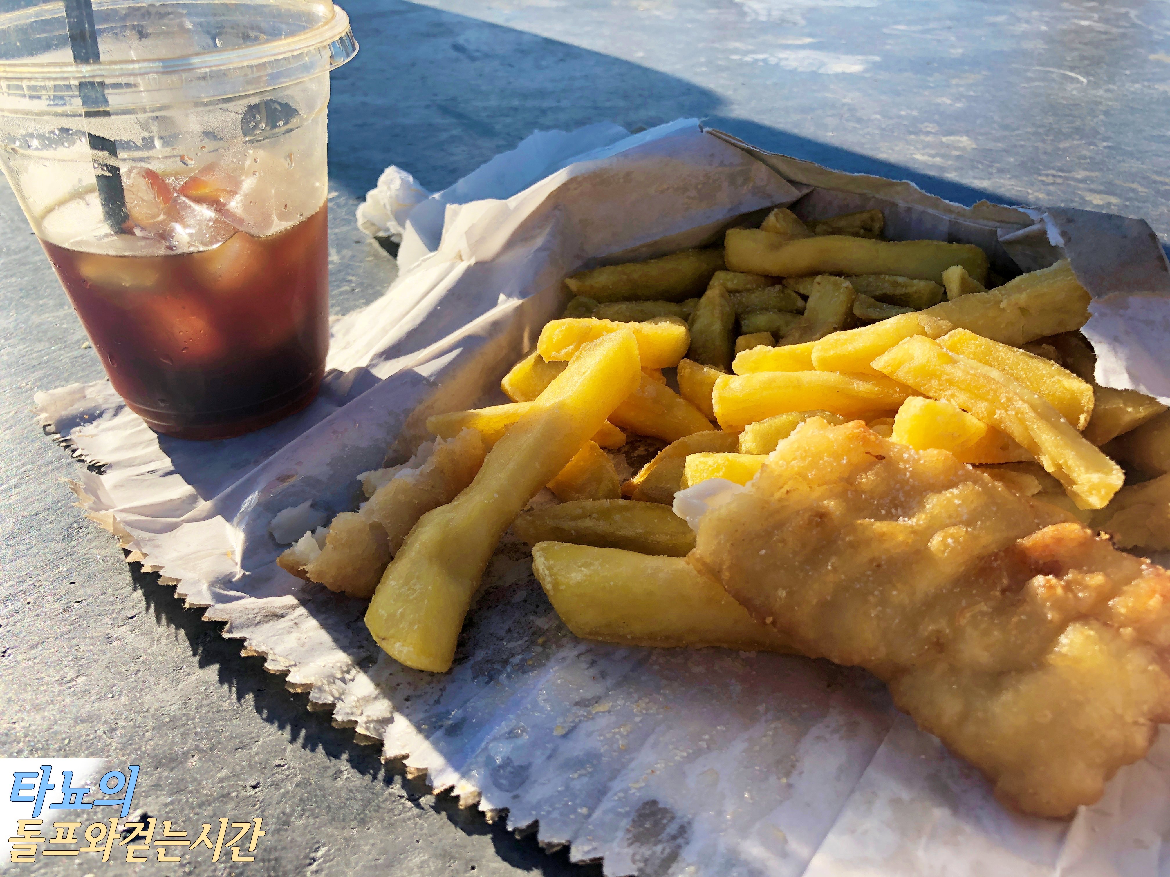 들른 김에 카페에서 커피도 한 잔 사고 신랑은 배가 고픈지 피시&칩스를 하나 구입했어요. 한데 칩스는 굉장히 맛이 없고 피시는 많이 비려서 얼마 먹지 못하고 버렸던 것 같네요 ^^;; 커피 맛도 별로였지만, 잠을 쫓기 위한 용도로 깔끔하게 마셨습니다.