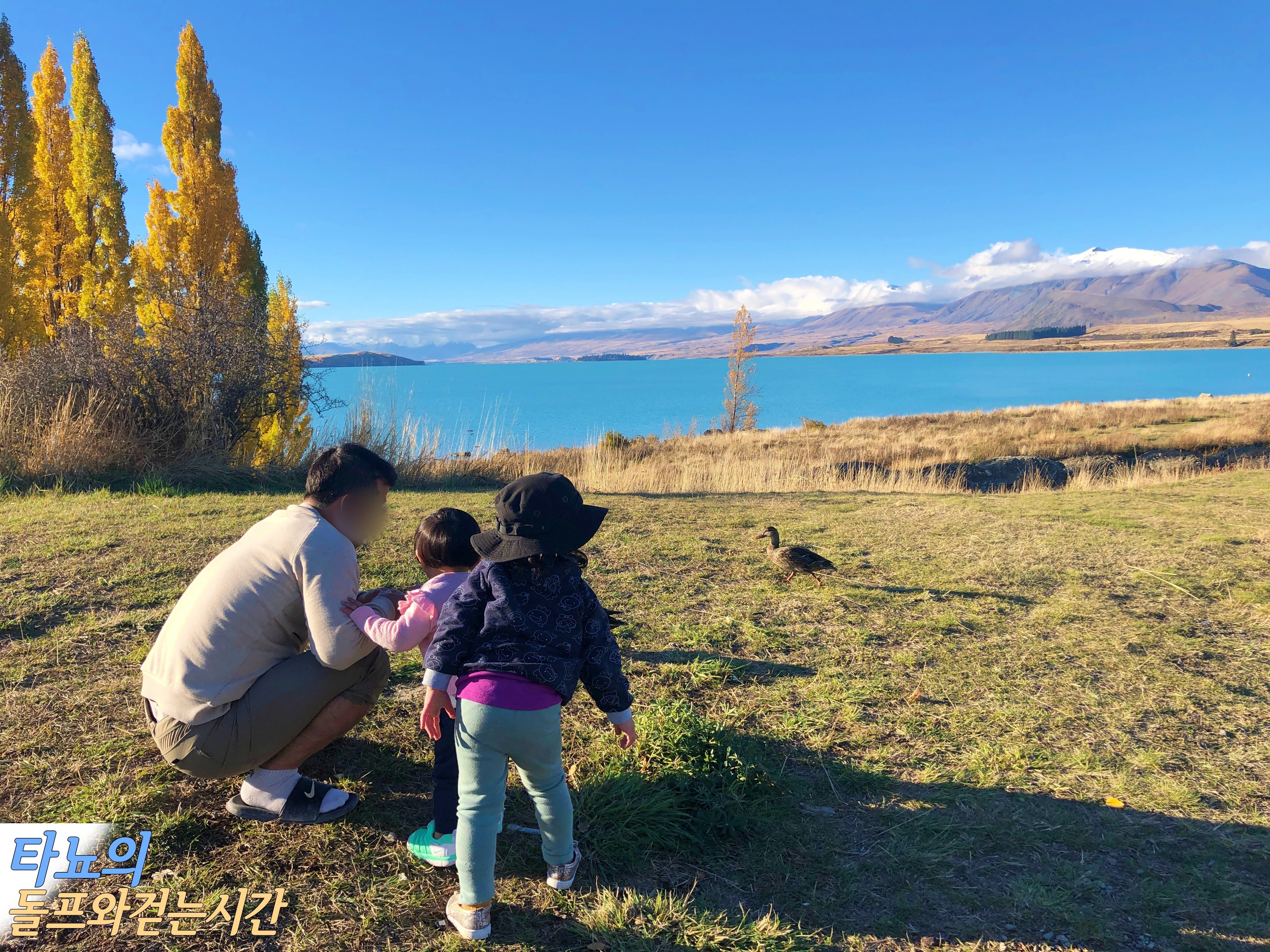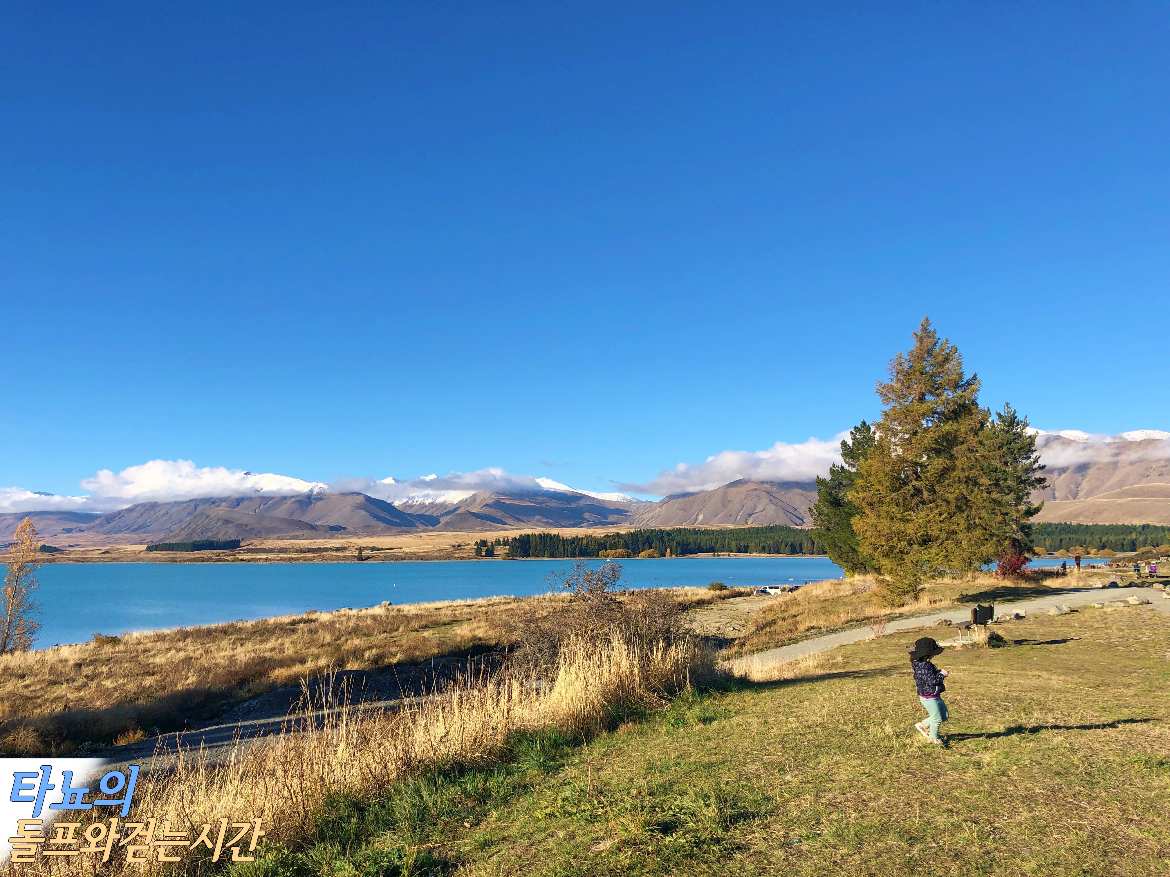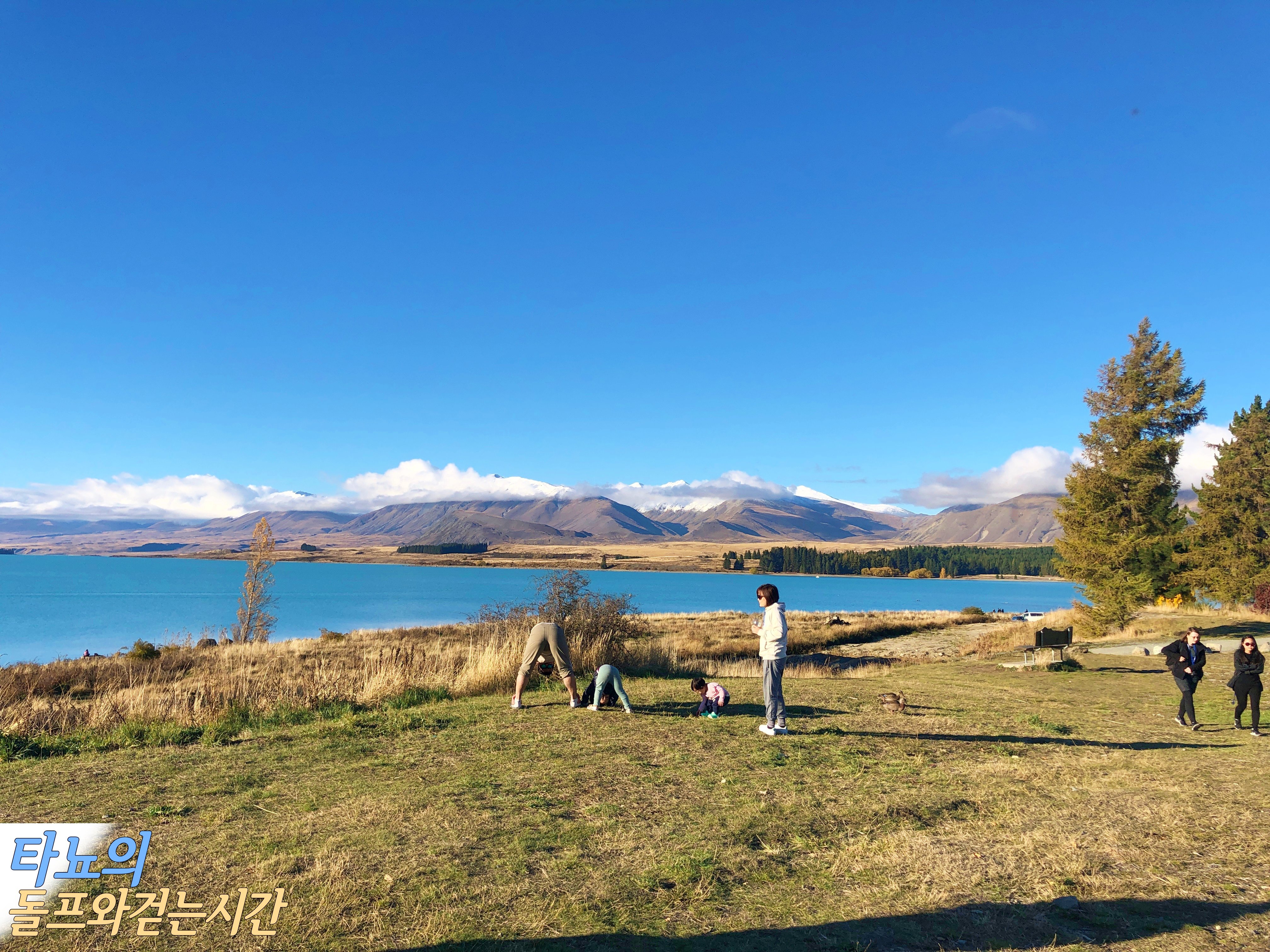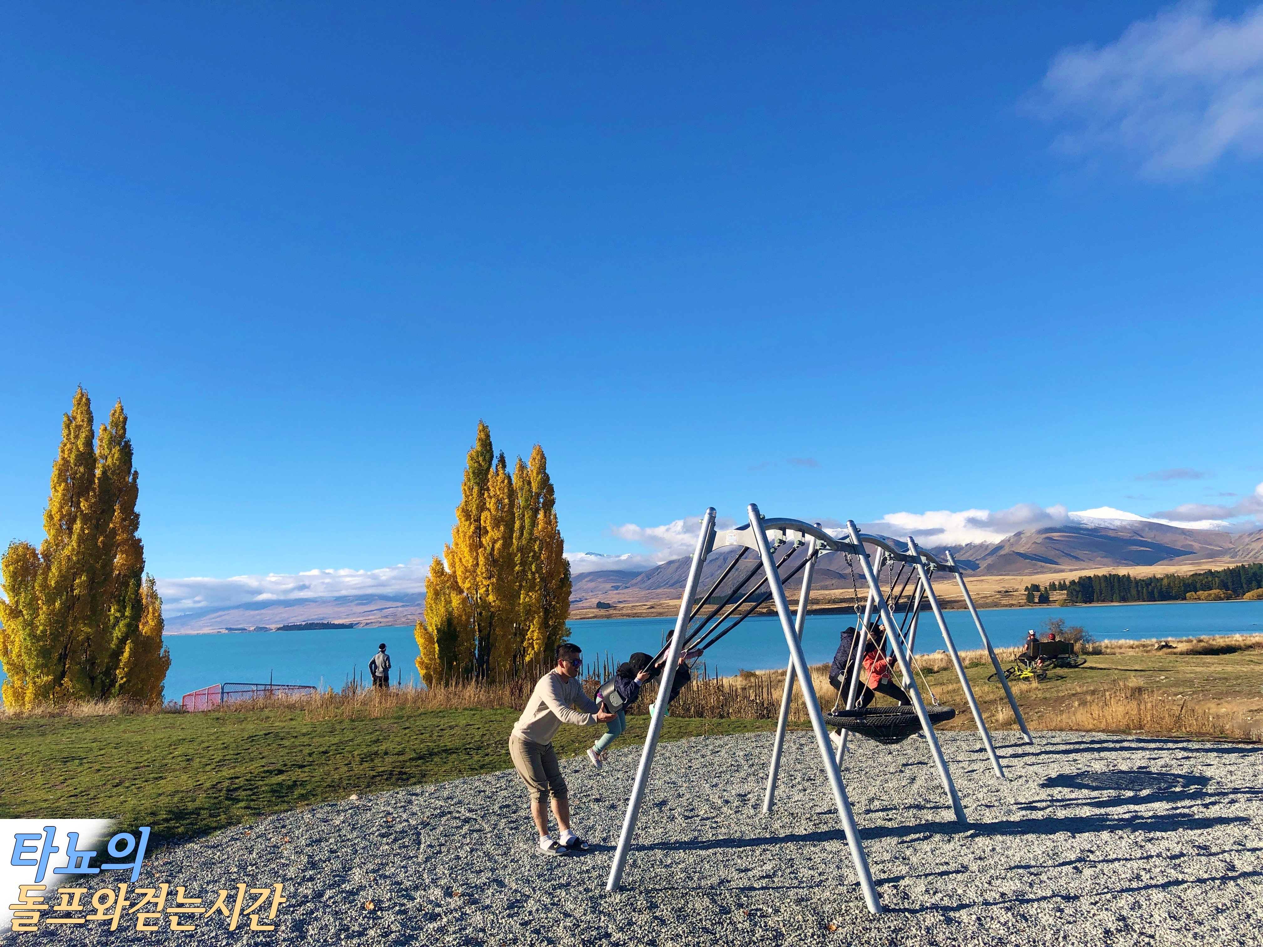 여행을 마치고 크라이스트처치로 돌아오는 길목에 다시 테카포에 잠시 들렀습니다. 어차피 지나가는 길, 아직은 조금 밝을 때 아이들 놀이터에서 조금이라도 놀게 해 주려고요. 역시 아이들이 가장 좋아하는 것은 놀이터의 그네입니다. 아이들이 이 아름다운 풍경에 무슨 감동이 있을까요. 그저 어른들의 만족을 위한 여행이었죠.