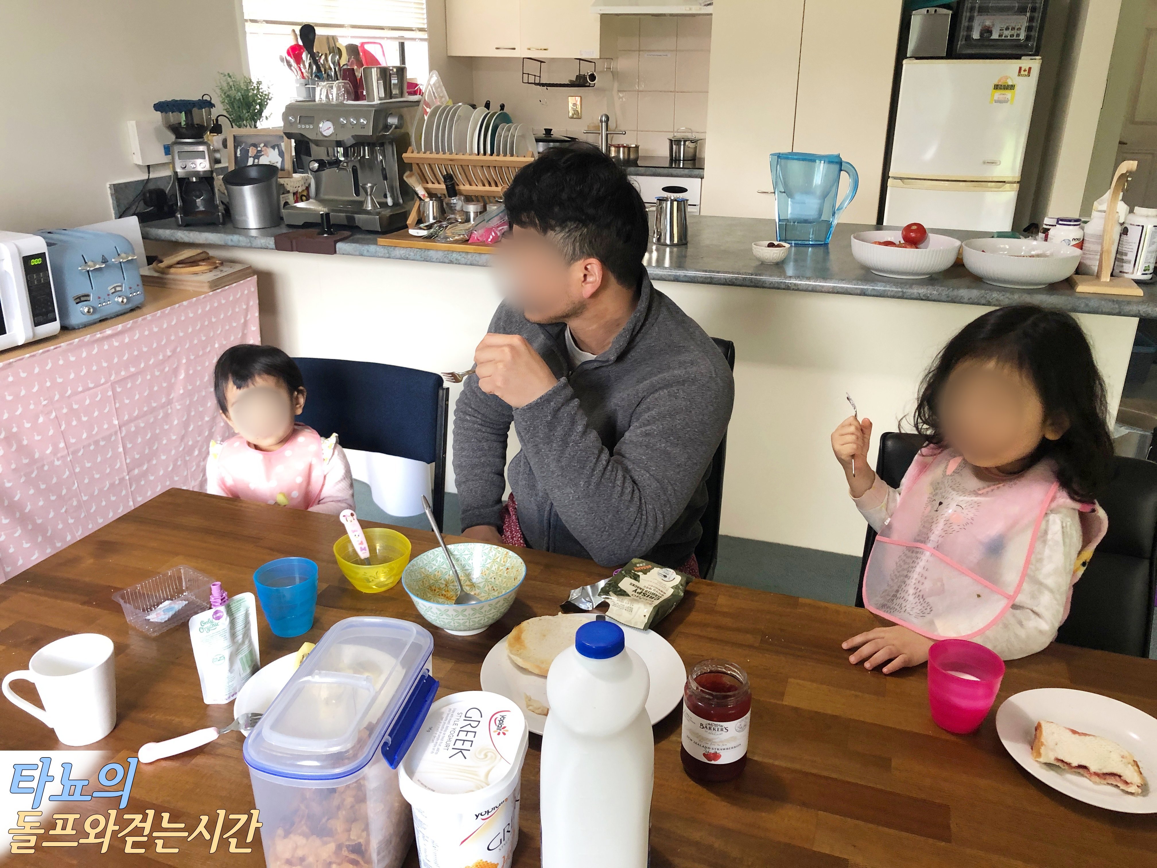 크라이스트처치의 스위트홈으로 돌아온 다음날 아침이에요. 아이들과 함께 아침 식사를 먹었습니다. 케이마트에서 2개에 3불에 구입한 턱받이가 큰 도움이 된 것 같아요.