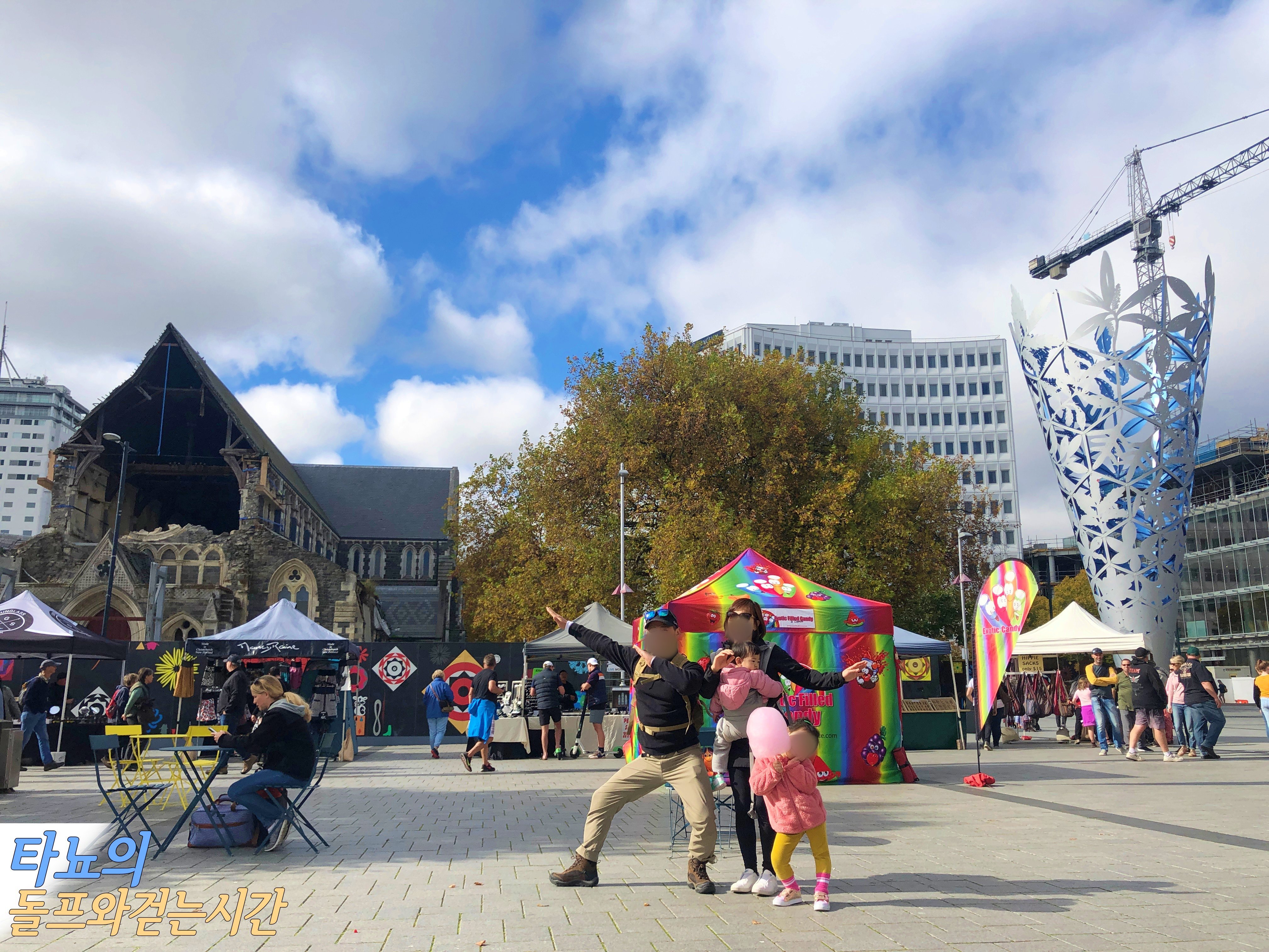 크라이스트처치 대성당이 있는 광장이에요. 왼쪽으로 무너진 채 아직까지 복구가 되지 않은 대성당이 보입니다. 이 가족들은 참 어딜 가나 귀엽고 사랑스럽네요. 포즈가 상당하죠!