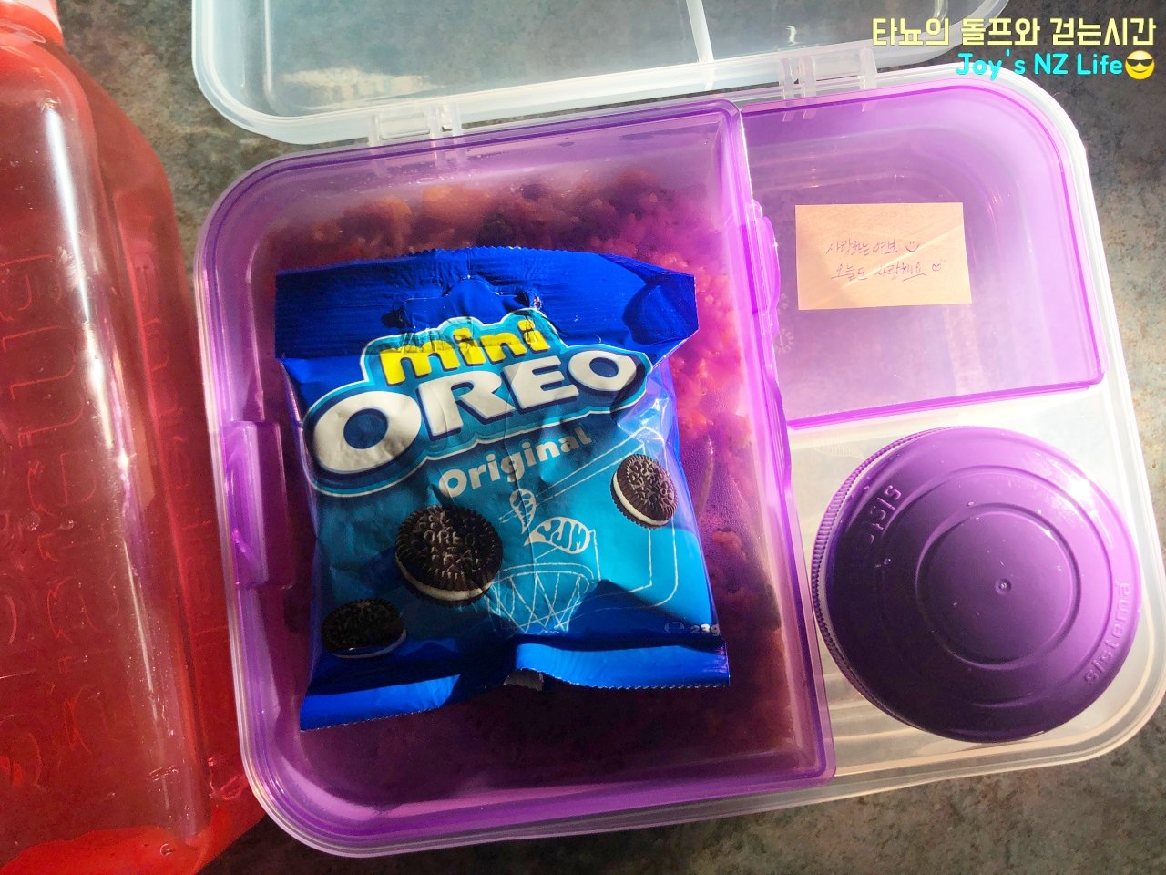여긴 점심 도시락으로 대부분 샌드위치나 토스트를 준비하다보니 도시락 통도 식빵용이에요. 그래서 이 날 한 번 쓰고 다시는 사용하지 않았답니다. 가끔 샌드위치 쌀 때만 사용할 것 같네요.ㅜㅜ.. 후식으로 준비한 미니 오레오는 저희 신랑이 굉장히 좋아하는 간식이에요. 그래도 풀떼기도 먹기를 바라며 토마토는 늘 넣어준답니다.