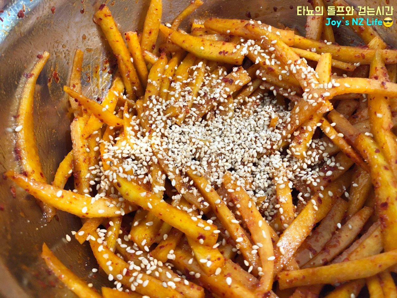 수박 껍데기 360g에 고춧가루 2큰술, 국간장 2큰술, 참기름 3큰술, 맛소금 1/2 작은술, 깨소금 1큰술 넣어서 조물조물 무쳐주세요. 저는 신랑이 생마늘 냄새 싫다고 해서 넣지 않았지만 간마늘 1 작은술 넣으면 더 맛있어요. 만약 입맛에 싱겁다면 맛소금을 조금 더 넣어주세요.