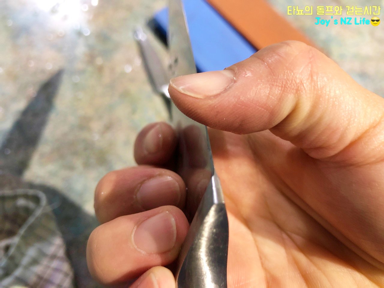 또 한가지는 칼날을 세워서 엄지손가락의 지문이 걸리는지 확인해보라고 했었어요. 지문이 걸리는게 무슨말인지 잘 모르겠다고 생각하시는 분들이 많으실 것 같은데요. 칼날이 아주 날카로우면 엄지 손가락의 지문이 오돌도돌한 느낌으로 칼날에 걸리더라고요. 힘줘서 누르면 위험할 수 있으니 확인 절차는 토마토로 하는 것이 가장 좋을 것 같네요.