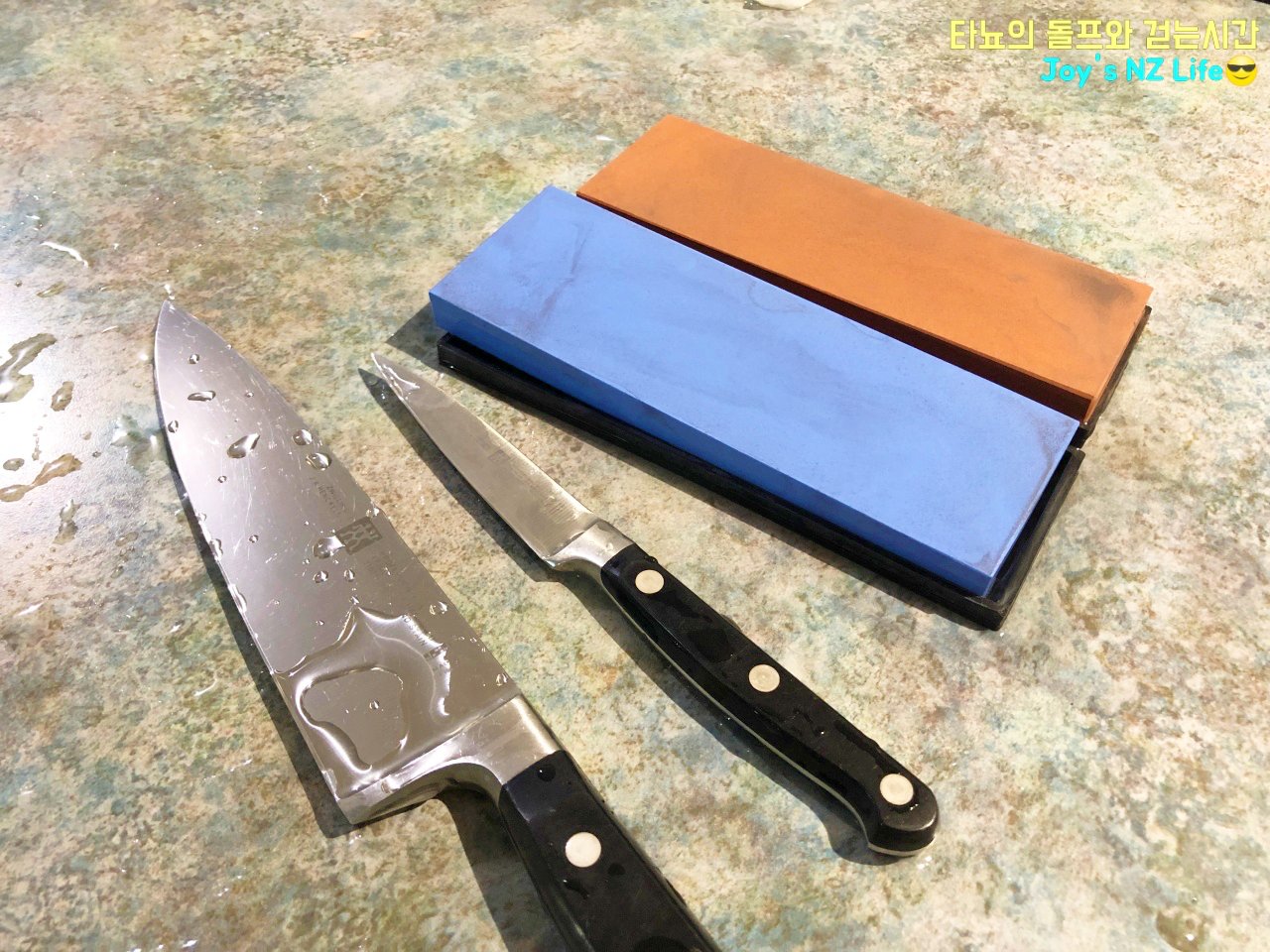 결혼할 때 혼수로 마련했던 소중한 칼들이 점차적으로 무뎌져가는 것을 많이 느꼈습니다. 작년까지는 쉐프 친구가 숫돌에 칼을 종종 갈아줘서 날카롭게 사용했었는데, 다른 지역으로 일을 옮기게 되면서 제 칼은 그저 방치가 되었네요. 흔히 야스리라고 부르는 칼 연마기가 칼세트에 있어서 꾸준하게 사용했지만 숫돌에 갈아서 사용을 해보니 천지차이더라고요.