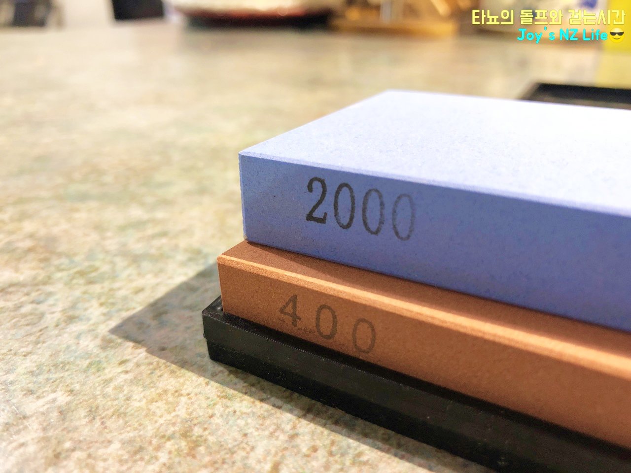 숫돌은 2000방과 400방을 하나씩 구입했습니다. 멀티로 붙어있는 제품도 있었지만 따로 된 것이 더 좋아보였어요. 숫돌을 고정할 수 있는 고무틀도 함께 주문했었는데 사용해보니 없었으면 큰일날뻔 했더라고요. 칼 갈 때 조금씩 미끌리기 때문에 고정틀은 꼭 필요한 것 같아요.