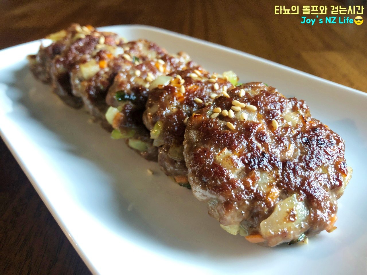 짠, 이렇게 완성된 소고기 떡갈비에요. 마침 굽기 시작할 때쯤 신랑이 학교를 마치고 돌아왔어요. 오후 4시라서 밥 때는 아니었지만 간식으로 먹기에 딱 좋은 타이밍이었죠.