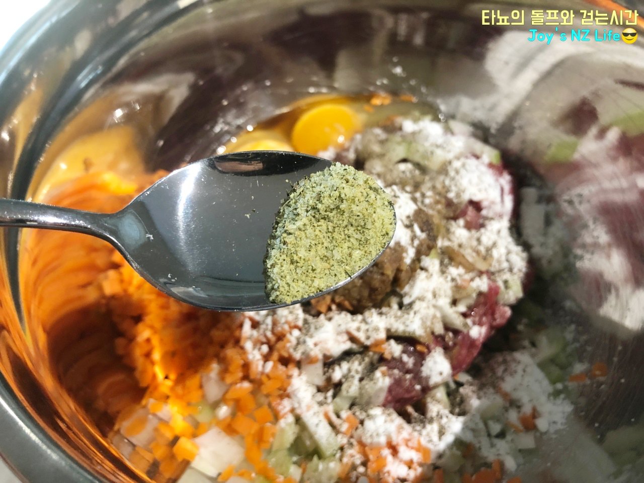 소고기 다짐육 500g의 양은 생각보다 많습니다. 저는 아침 저녁으로 구워주려고 조금 넉넉하게 준비를 했습니다. 로컬마트에서 판매하는 소고기 다짐육은 기름기가 상당히 많아서 하얀색과 붉은색 비율이 거의 비슷한 편인데요. 한인 정육점에서 구입하는 다짐육은 담백하게 나오는 편이라 꽤 마음에 듭니다.