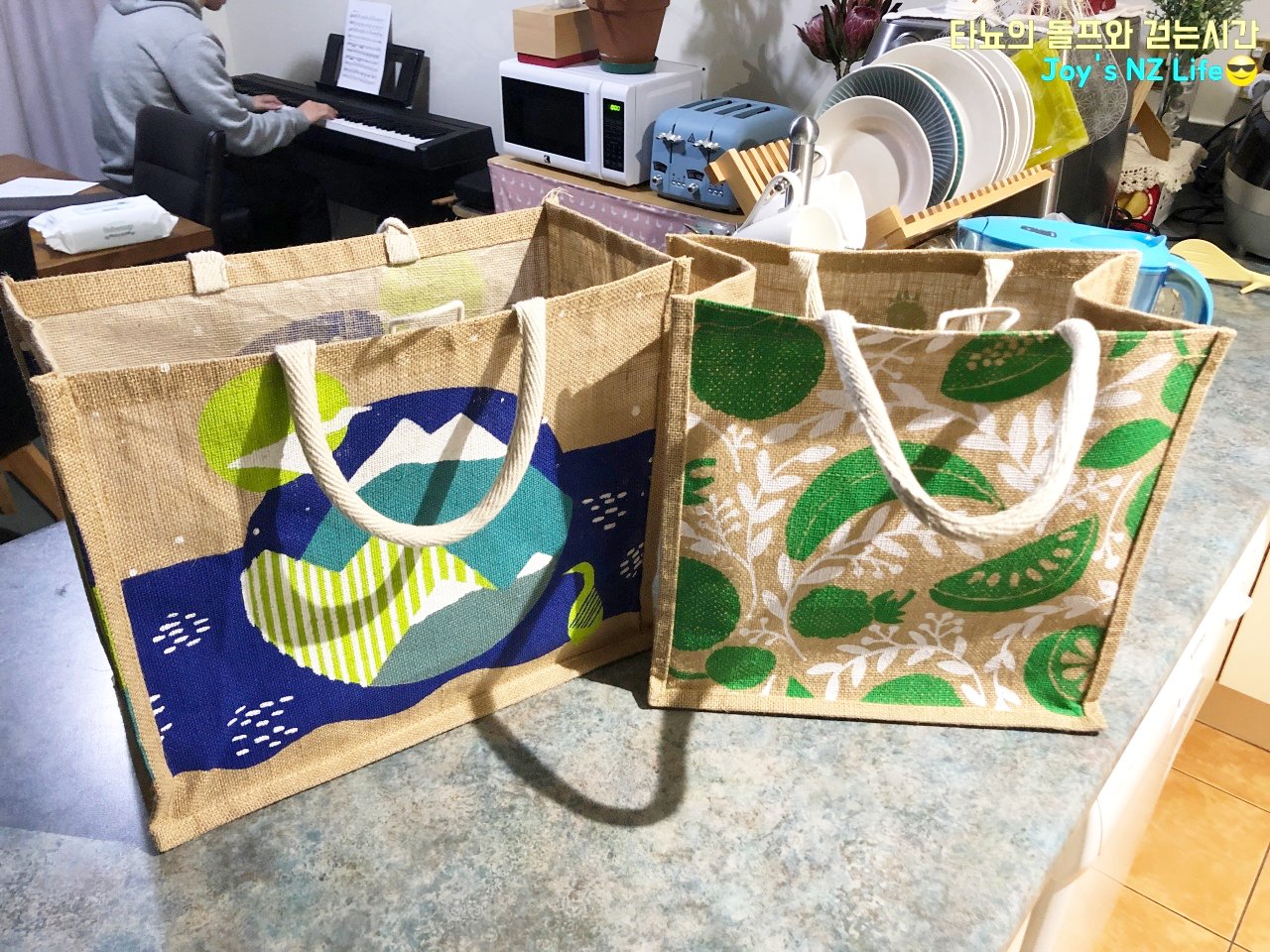 요즘 즐겨 사용하는 장바구니예요. 카운트다운에서 구입했는데 소재가 좋아서 굉장히 튼튼하고 안전하게 사용하고 있답니다. 올 초부터 뉴질랜드는 장바구니 사용을 권면하고 각종 마트마다 비닐봉지 사용을 자제하고 있는데요. 7월부터는 법적으로 비닐봉투 사용이 금지됩니다.