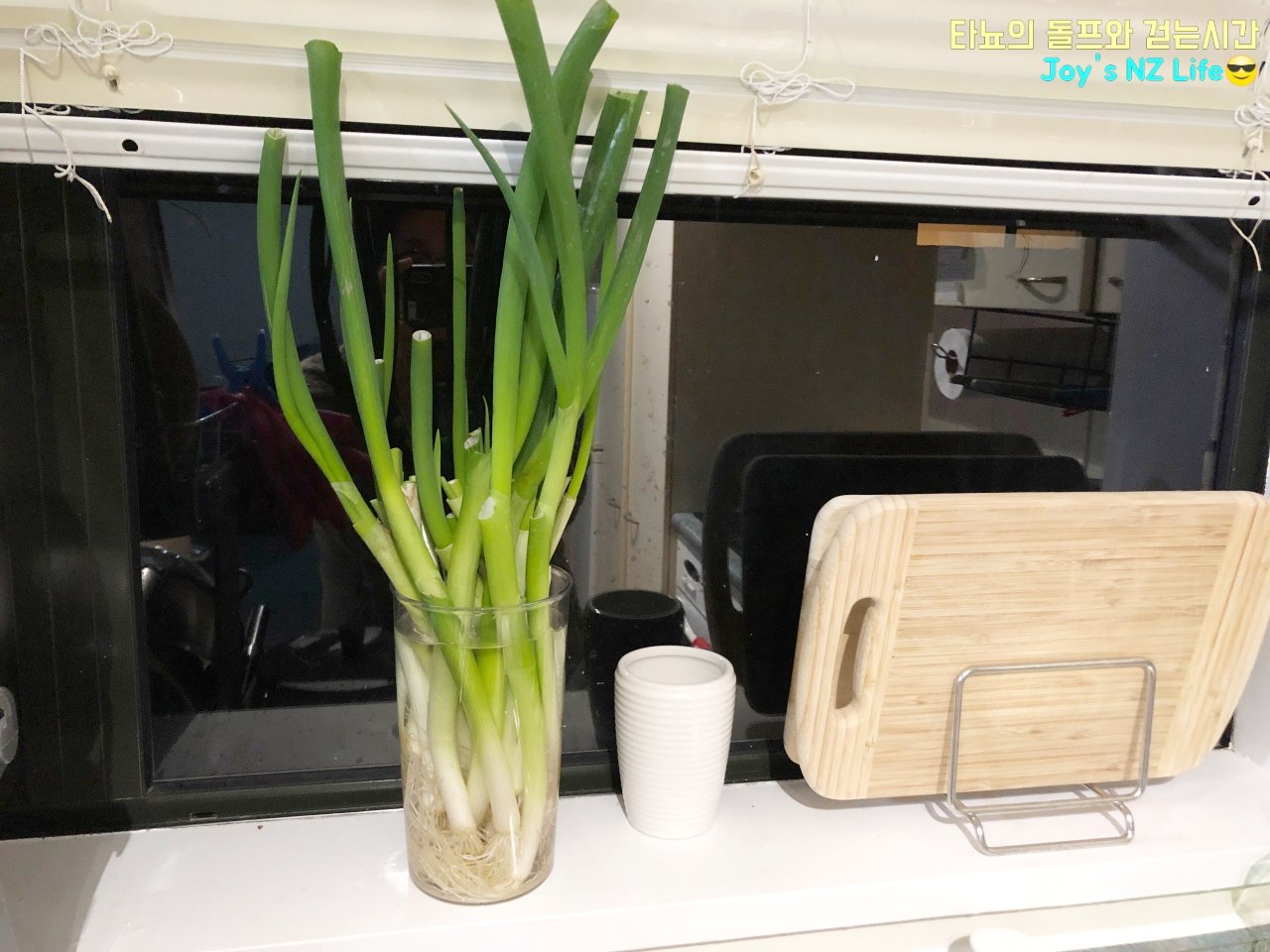 대파는 구입하자마자 바로 물에 꽂았어요. 총 2단을 구입했는데 보통 1단이 4 뿌리 정도입니다. 겨울에는 밖에서 키우는 것도 힘들어서 보통 주방에 저렇게 꽂아두고 필요할 때마다 잘라서 먹어요. 생각보다 쑥쑥 자라는 것 같아서 제 일상의 작은 기쁨이랍니다.