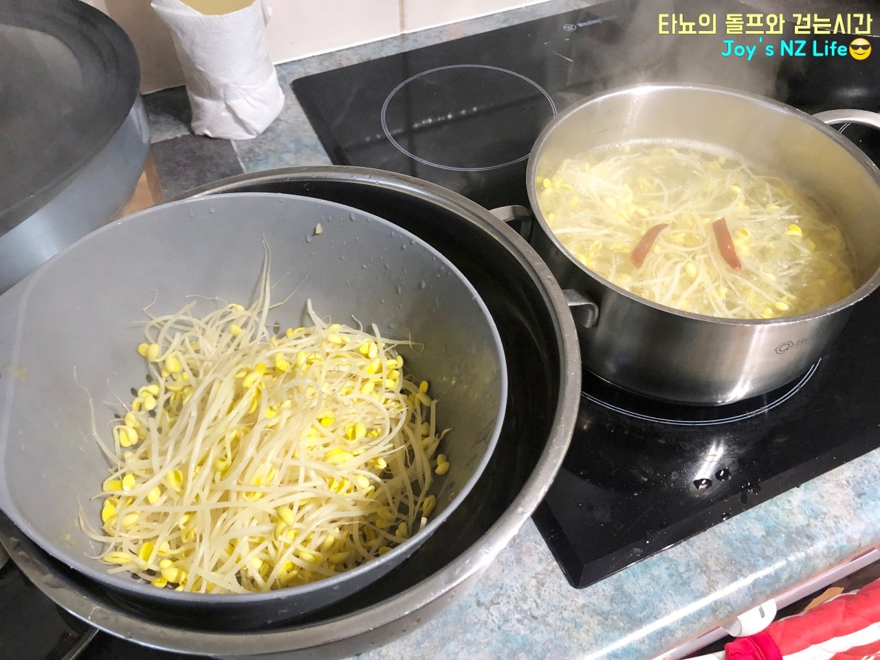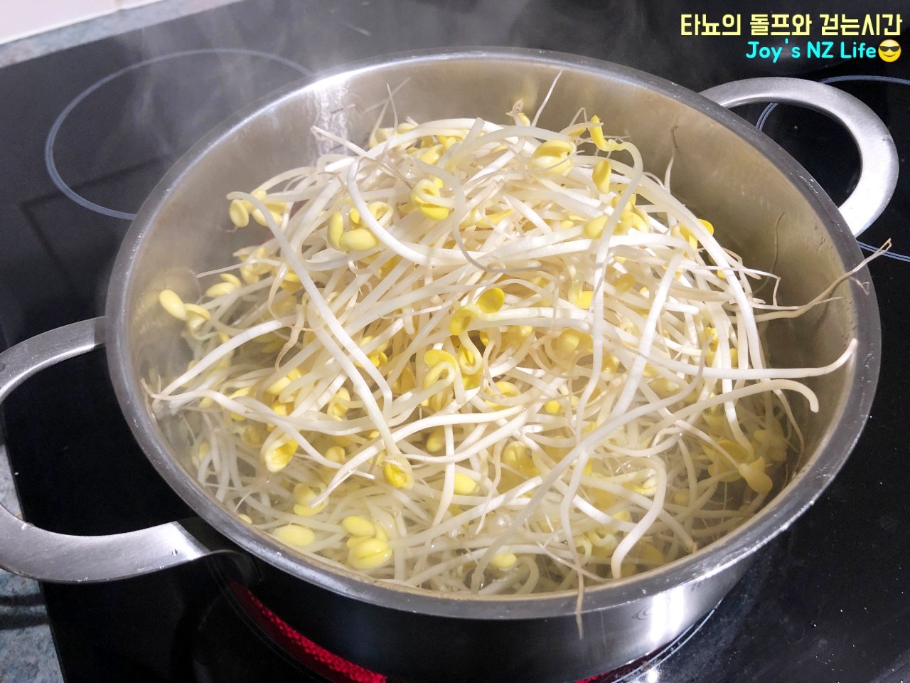 씻은 콩나물 1봉지 모두 넣었어요. 냄비보다 콩나물 양이 조금 많은 것 같지요? 저는 콩나물 사면 늘 한 번에 삶는데 이렇게 삶은 뒤 반은 건져내서 나물로 무쳐먹곤 합니다. 한 번의 조리로 두 가지의 음식을 준비할 수 있지요. 콩나물국과 콩나물 무침!