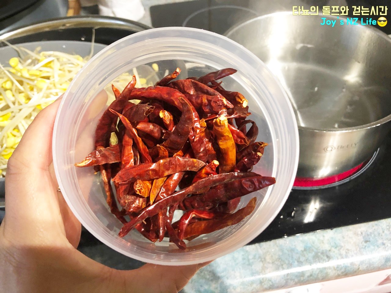 청양고추가 있다면 청양고추 사용하셔도 됩니다. 저는 여기서 흔하게 사용되는 매운 고추인 타이고추를 사용했어요. 물에 먼저 넣어주세요. 저는 개인적으로 매콤한 콩나물 국물 좋아해서 한두 개씩 넣는 편인데, 매운 거 싫어하시면 생략하시면 됩니다. 정말 맵게 드시고 싶다면 더 넣으시면 되고요.
