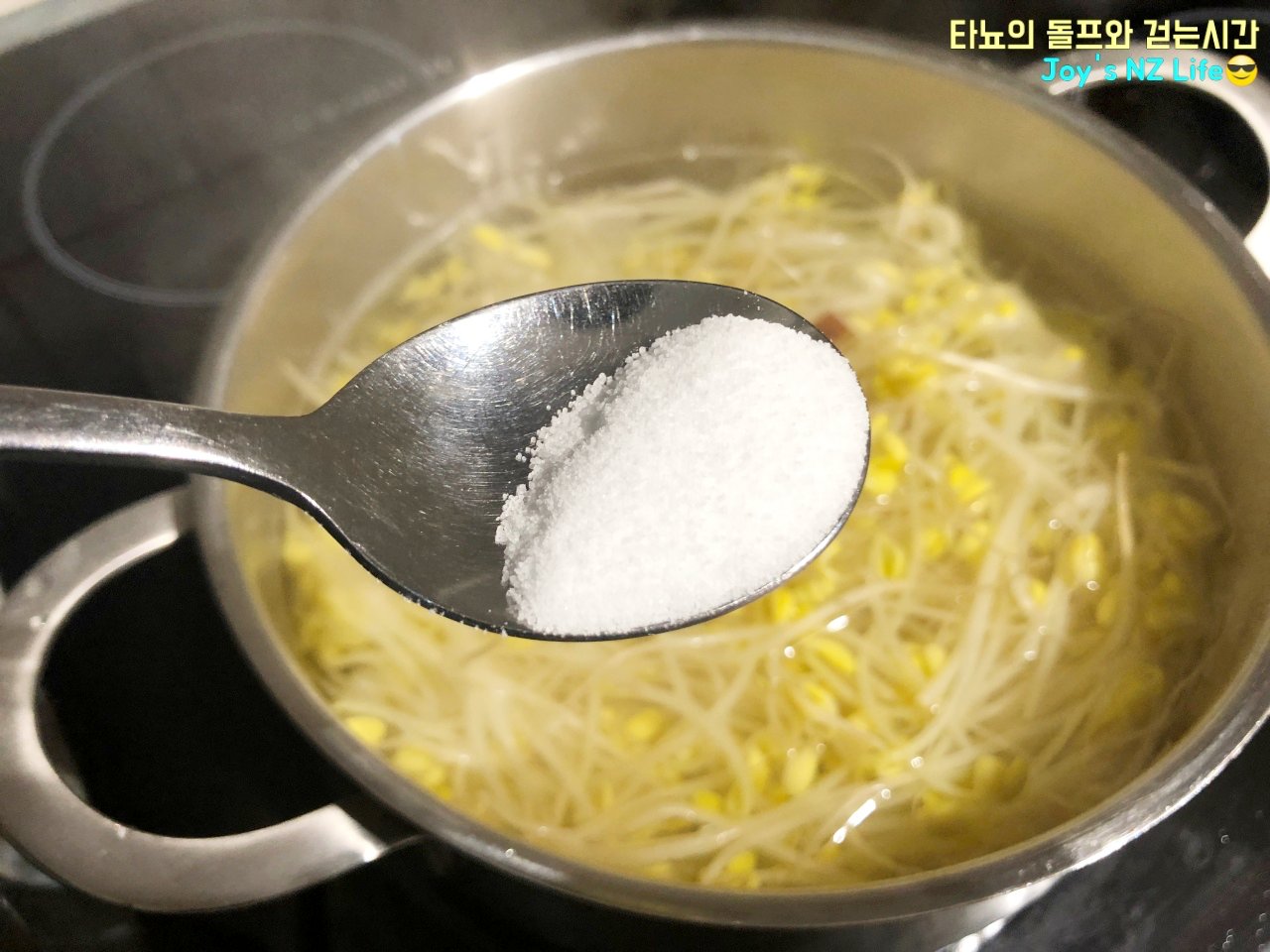 맛소금 1큰술 넣어서 간을 맞췄어요. 평소 같으면 각종 재료 넣은 육수에 간수 뺀 굵은 소금으로 간을 맞췄겠지만, 오늘은 초간단 뚝딱 콩나물 국이니 아주 간단하게 가는 거죠.