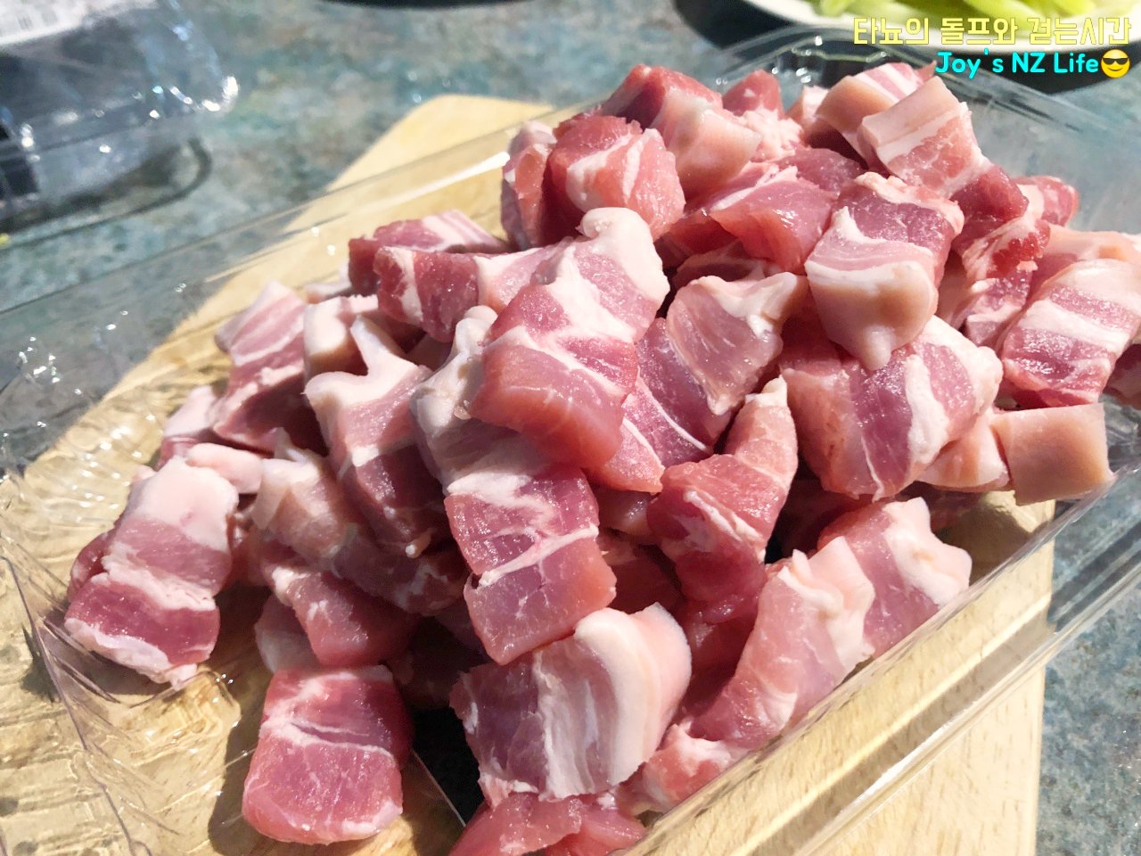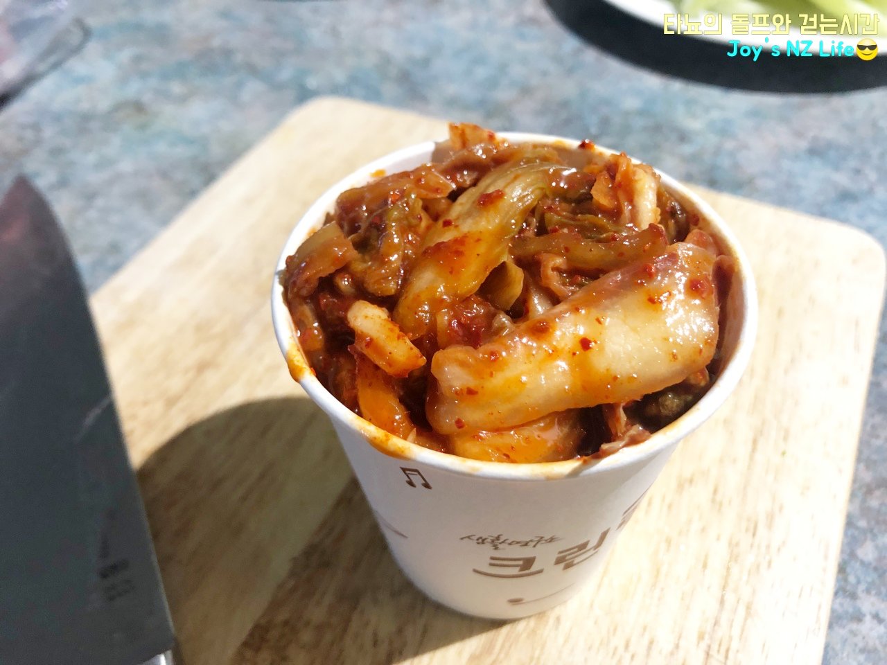 종이컵에 신김치 꾹꾹 눌러 담아 2컵 준비했고 삼겹살은 먹기 좋은 크기로 잘라서 준비했어요. 뉴질랜드의 삼겹살은 한국 삼겹살보다는 기름기가 적은 것 같아요. 그래도 한인 정육점에서는 어떻게 구하는지 기름기 최대한 많은 걸로만(나름 한국식 삼겹살?) 판매하는 것 같더라고요. 그래서 삼겹살은 보통 로컬마트에서 구입하게 되는 것 같아요.