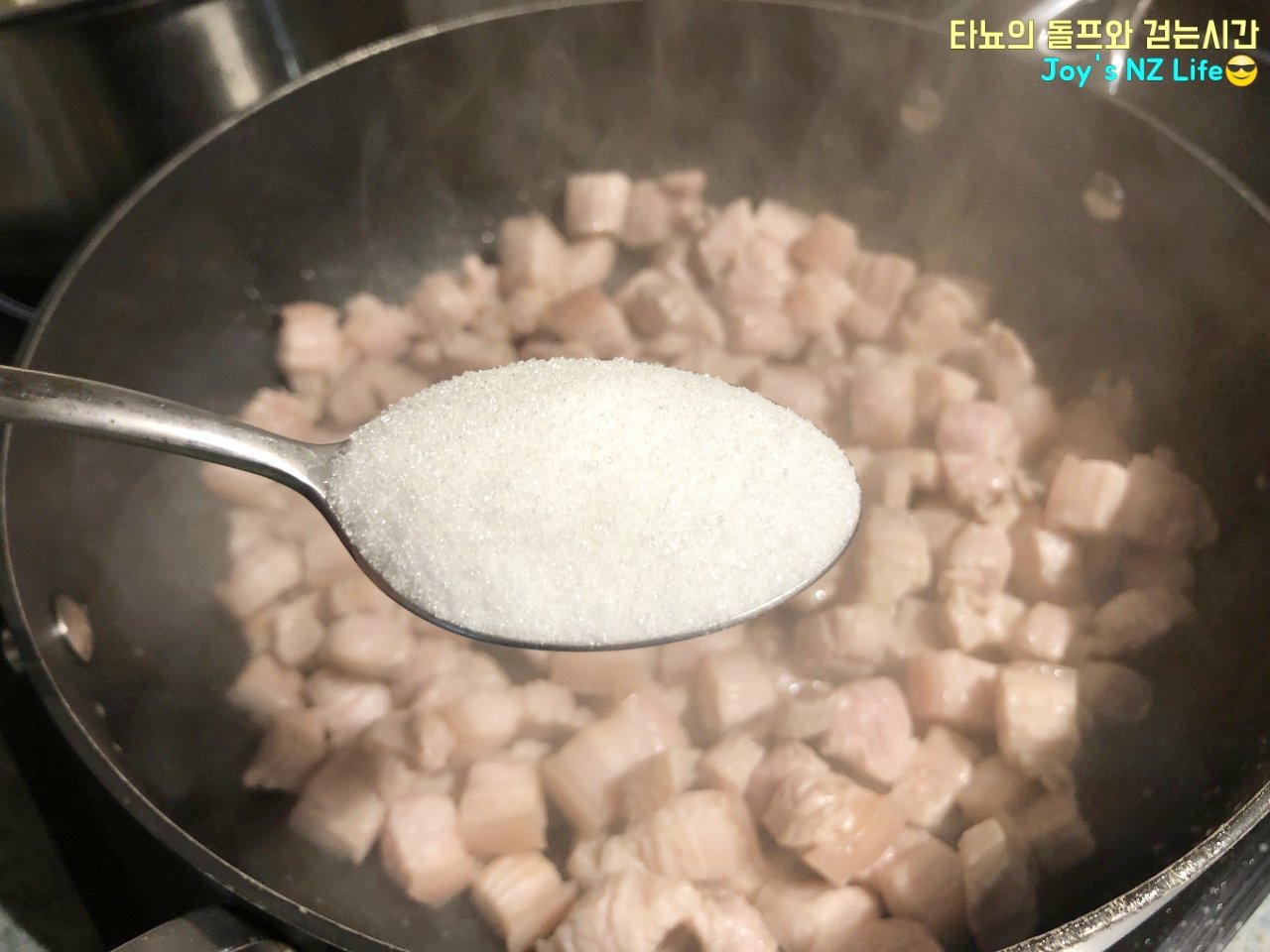 삼겹살이 거의 다 익어가면 설탕 3큰술 넣어서 조금 더 볶아주세요. 설탕 넣어서 볶으면 잡내도 싹 잡아주고 이 때 물기가 조금 생길 거예요. 설탕 싫어하셔도 두루치기에 살짝 넣어주면 맛이 훨씬 좋아지는 편이에요.