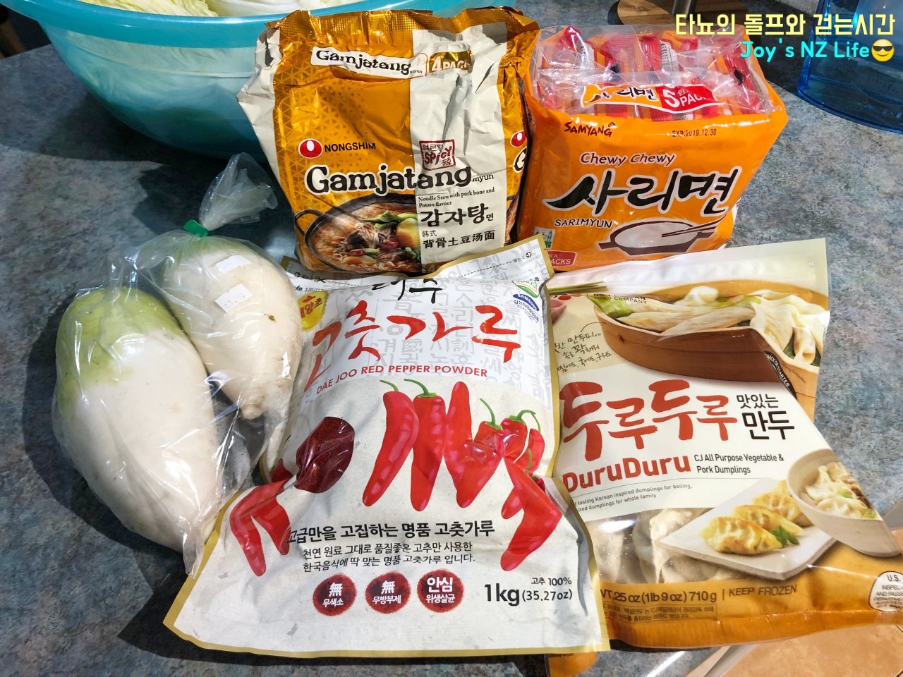 한인마트에서 구입한 품목이에요. 보이지 않던 감자탕면이 입고되었길래 구입해봤어요. 아직 먹어보지 못한 맛이라 기대가 됩니다. 사리면은 떡볶이 만들어 먹을 때 넣어달라고 신랑이 요청을 했네요.