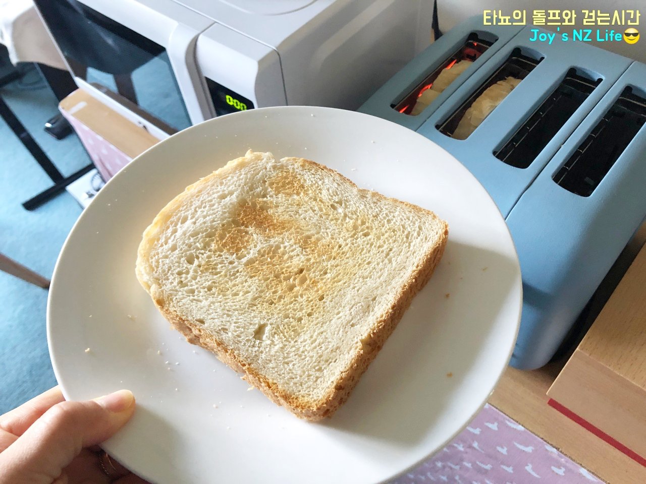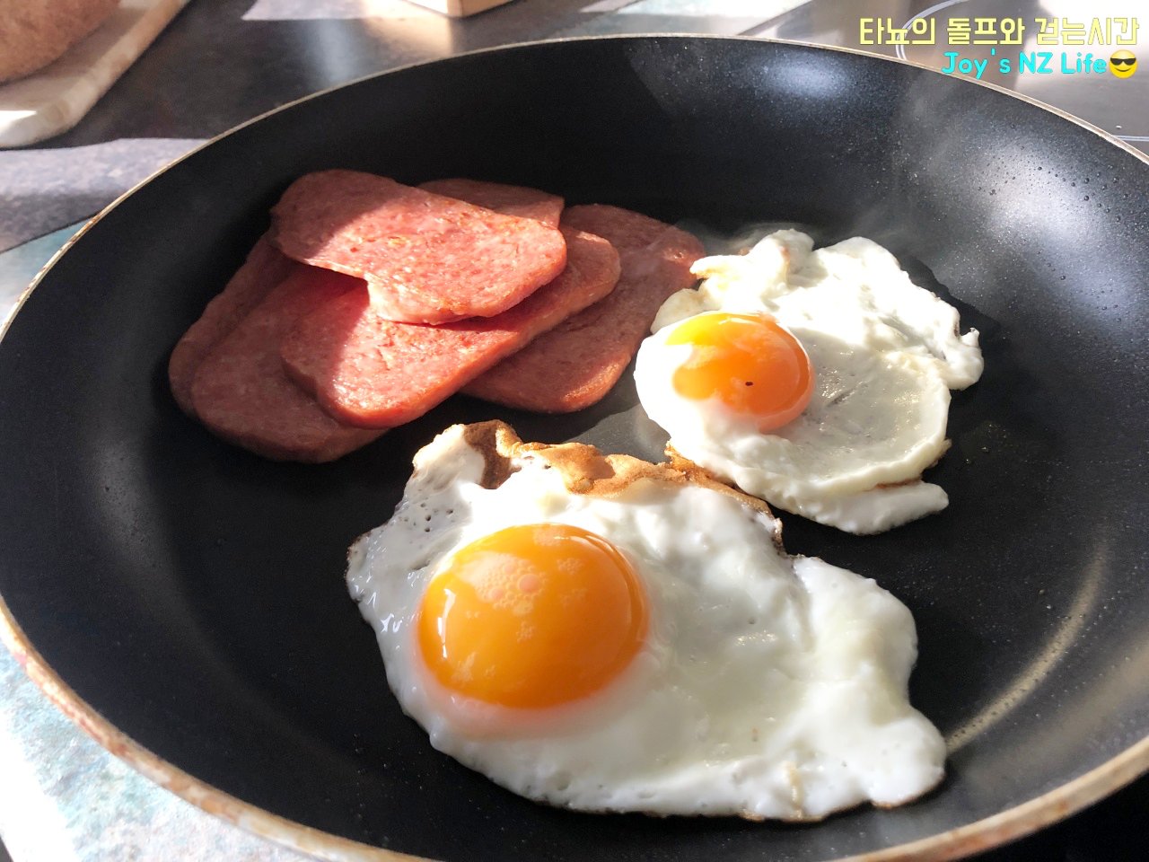 고소한 버터 듬뿍 바르고 슬라이스 치즈와 스팸, 달걀 얹어서 토마토와 곁들여 먹었습니다. 스팸 대신 베이컨을 종종 얹어 먹기도 하는데 신랑은 스팸을 더 좋아하는 것 같아요.