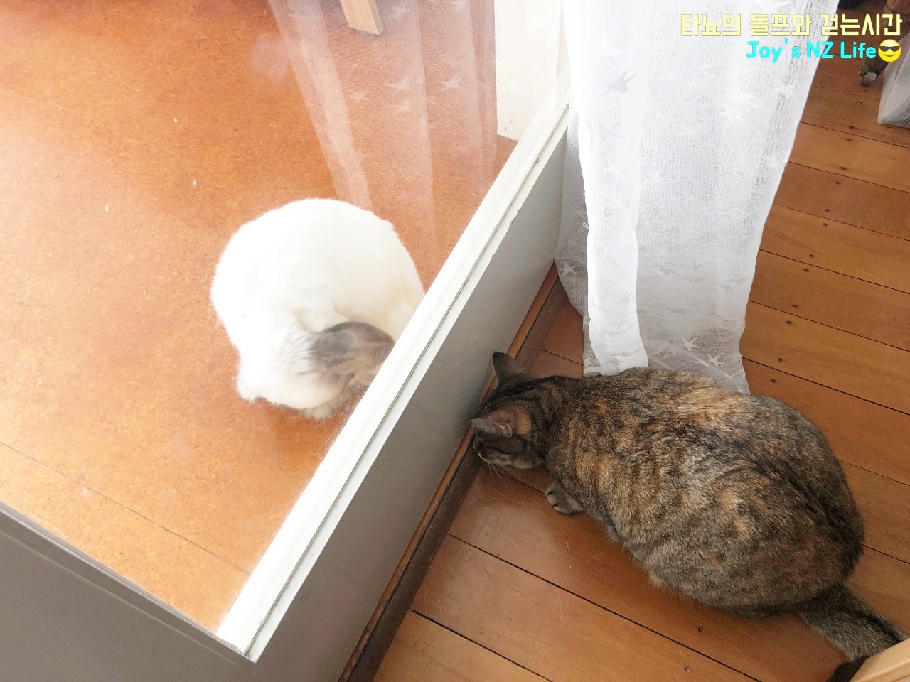 너무 귀엽죠? 나이로 치면 모찌는 할머니 토끼인데 그에 비해 호두는 어린 고양이예요. 모찌에게 한 번 물려본 경험이 있다는 호두는 고양이지만 모찌를 무서워하더라고요. 아마도 어릴 적 물렸던 기억이 아직도 생생한가 봐요.