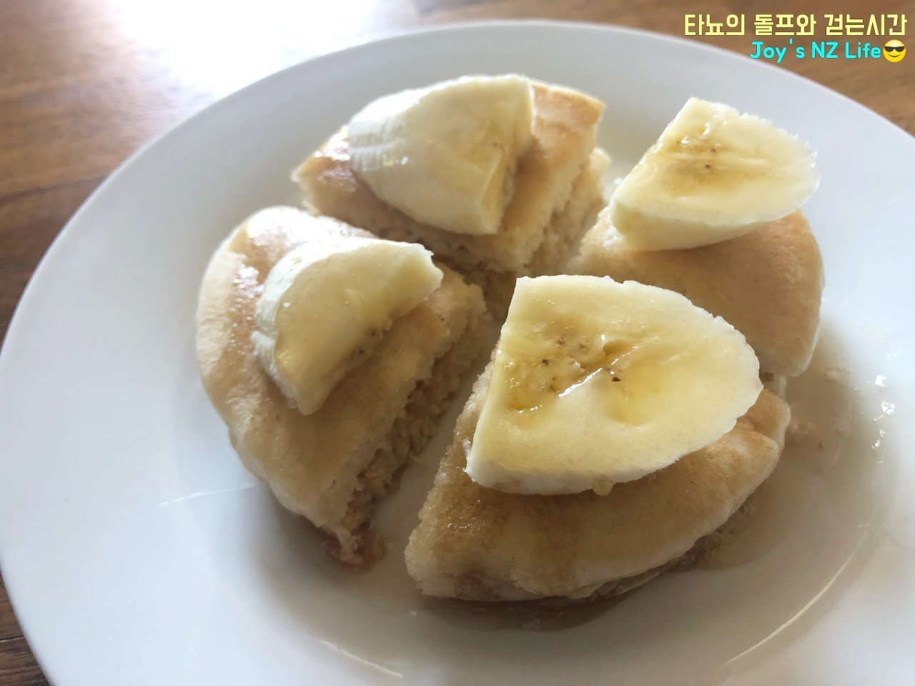 아침으로 오랜만에 먹은 핫케익이에요. 꿀에 조린 사과를 얹어도 맛있지만, 아침부터 만들 열정은 없었어요. 그저 바나나 하나 똑 따서 얹어 먹었답니다. 핫케익만 먹으면 조금 텁텁할 수 있는데 바나나를 얹으면 굉장히 부드러운 느낌이 나요.