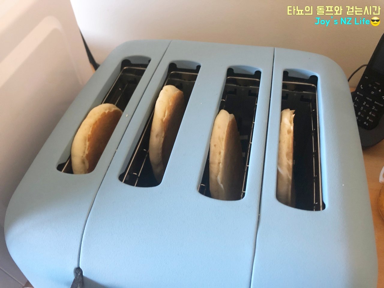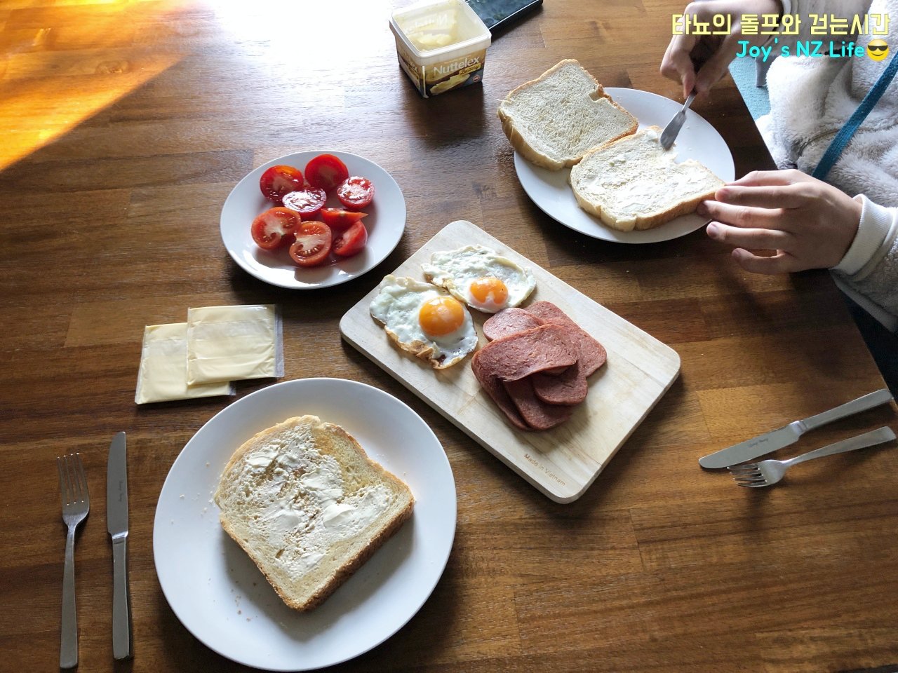 고소한 버터 듬뿍 바르고 슬라이스 치즈와 스팸, 달걀 얹어서 토마토와 곁들여 먹었습니다. 스팸 대신 베이컨을 종종 얹어 먹기도 하는데 신랑은 스팸을 더 좋아하는 것 같아요.