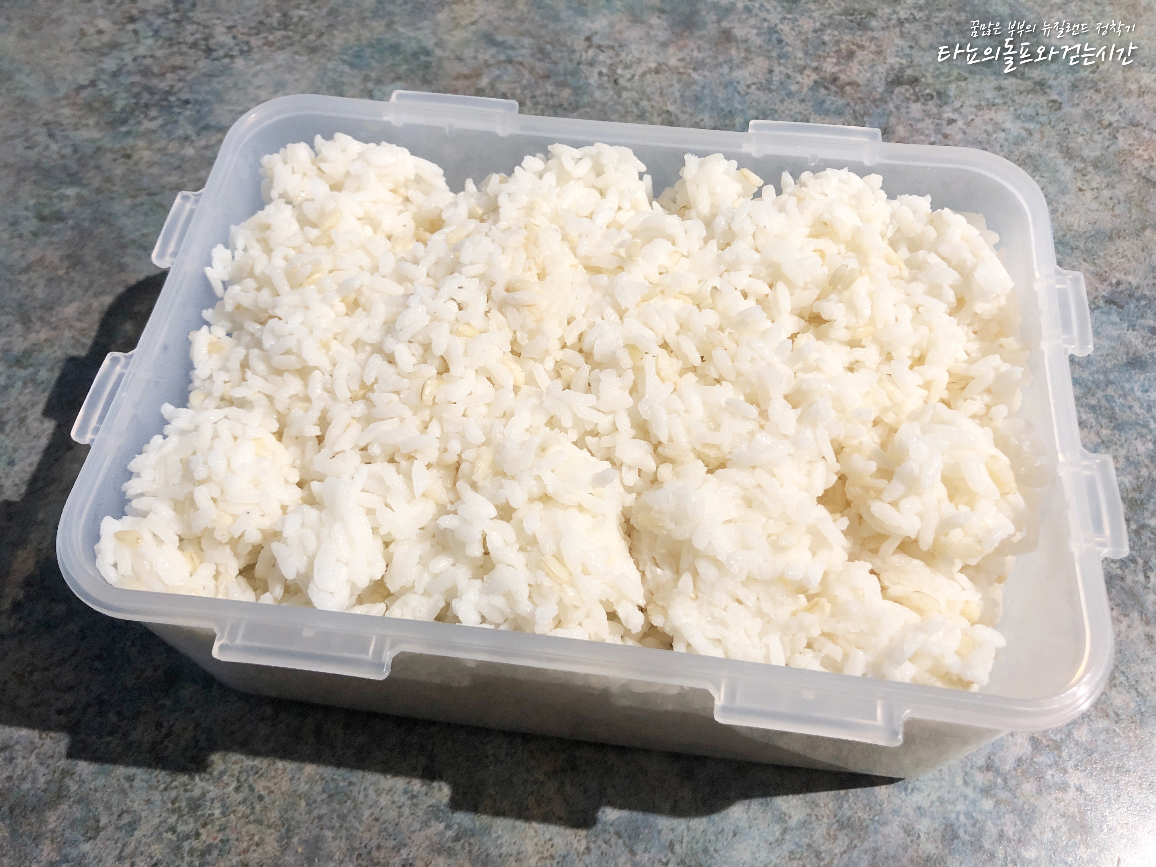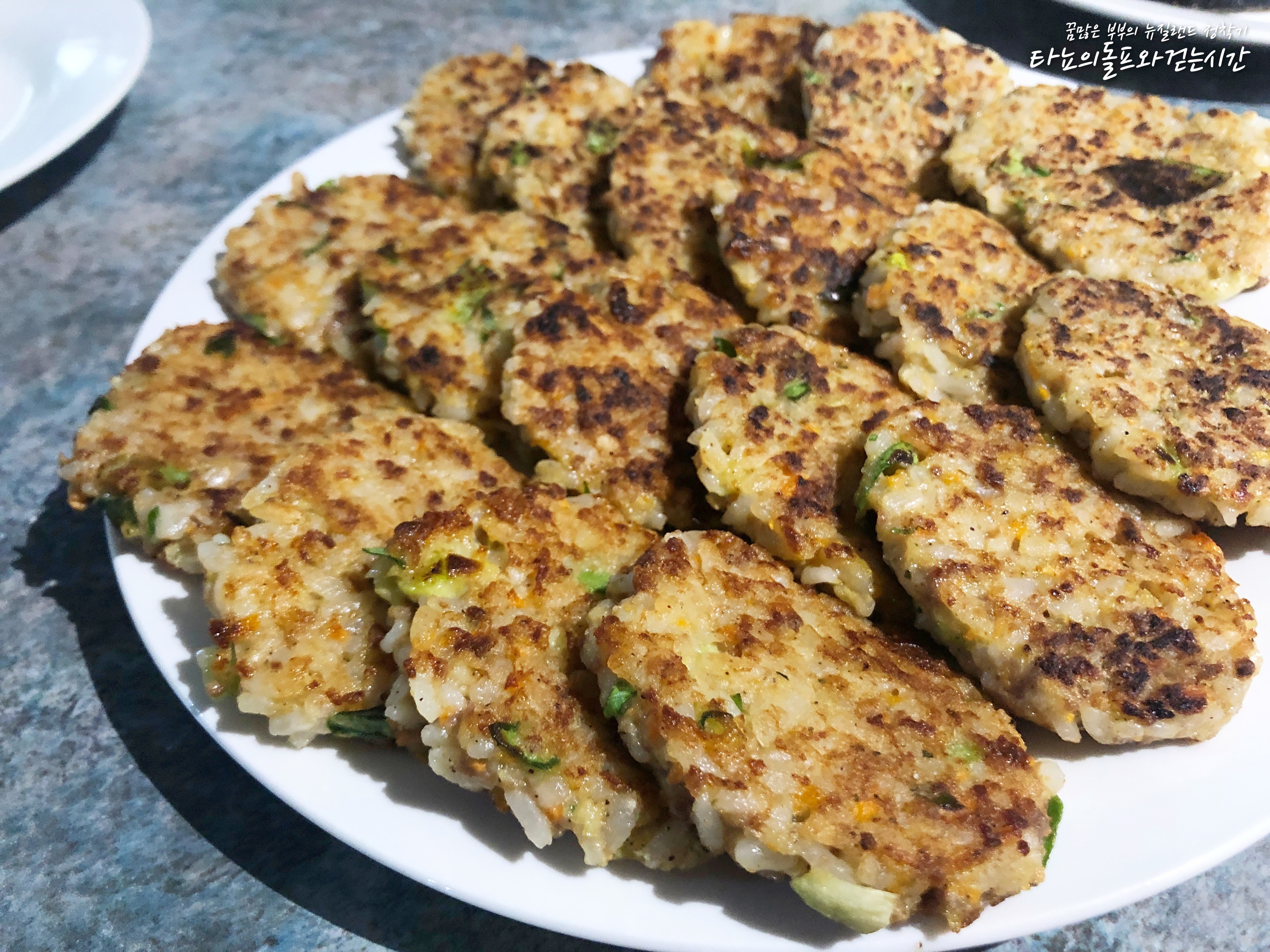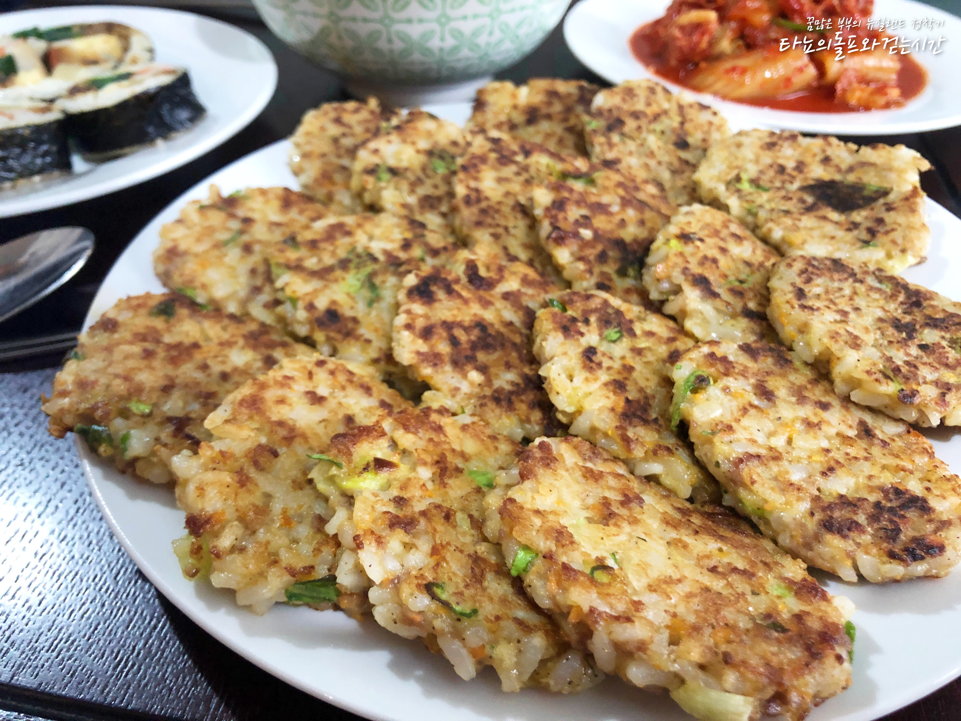 여행을 다녀온 것 까지는 좋았는데 숙소에서 만들었던 밥이 생각보다 너무 많이 남았어요. 그렇다고 멀쩡한 밥을 버리는 건 너무 아까워서 통에 담아 왔습니다. 이미 차갑고 단단하게 식어버린 밥을 어떻게 해결하면 좋을까 싶었는데 그때 마침 떠오른 아이디어가 밥전이에요.