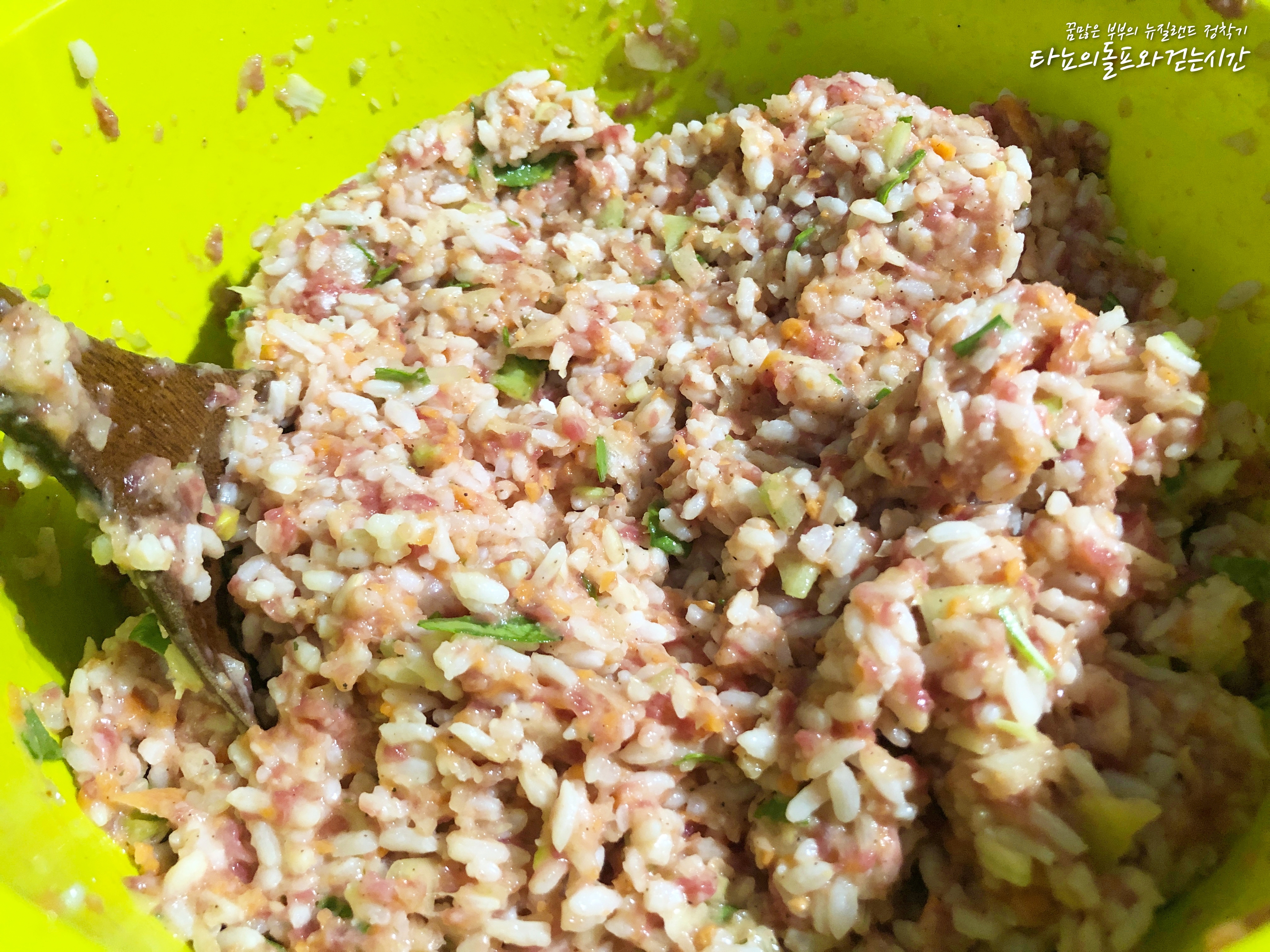 가까운 정육점에 가서 소고기 다짐육을 구입했어요. 흔히 카페에서 사용하는 얼음 스쿱으로 1스쿱을 구입해서 몽땅 넣었습니다. 당근 2개와 양파 1개, 감자 1개를 곱게 다져서 넣고 초록빛을 내려고 청경채 3개를 사용했어요. 쥬키니 호박이나 애호박, 대파 등을 사용해도 비슷한 색감을 낼 수 있어요. 달걀은 총 4개를 넣었습니다.