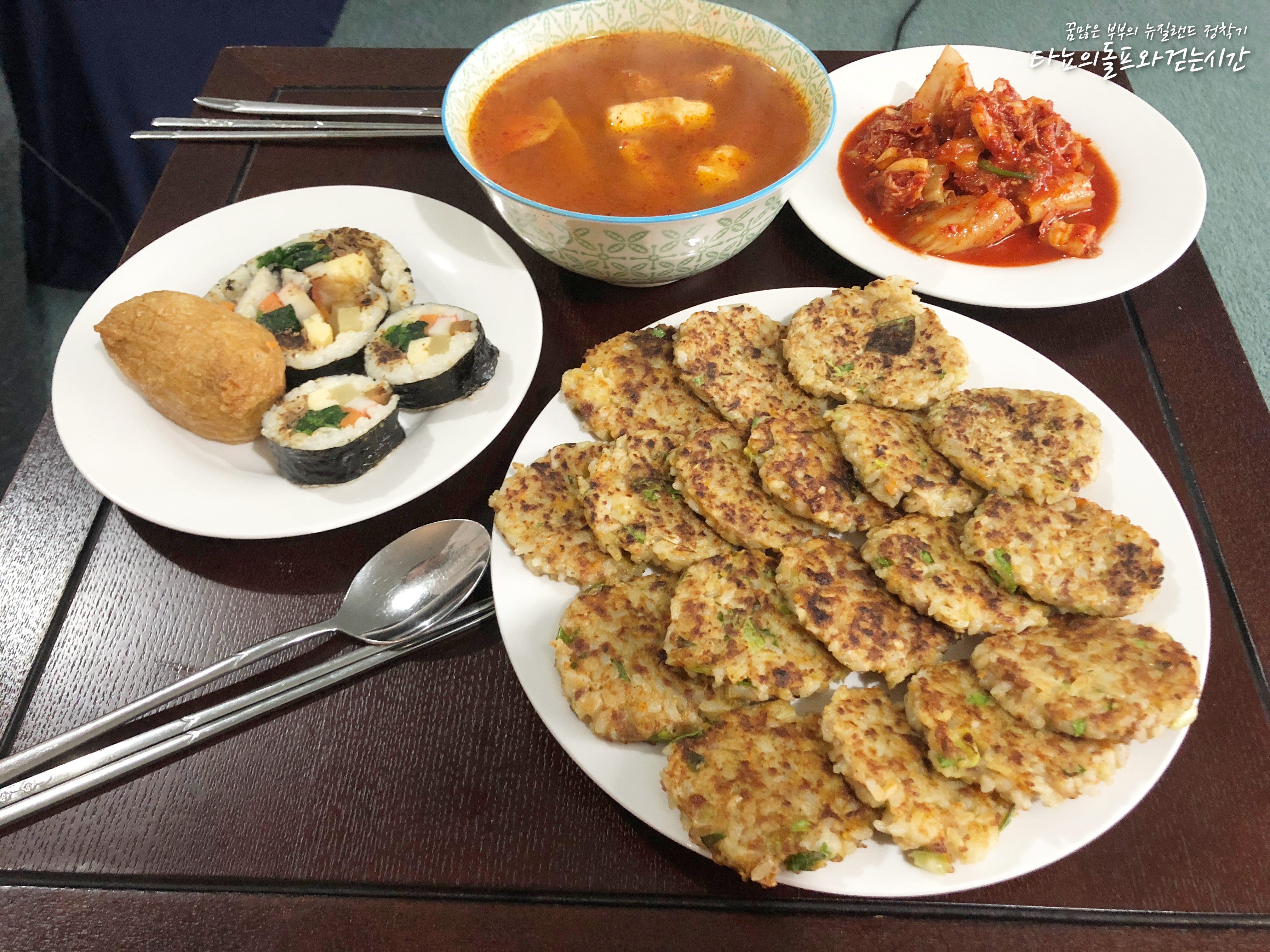 노릇노릇하게 구워봤어요. 전분이 들어가니 확실히 굽다가 부서지는 일은 없더라고요. 찬밥도 구워서 먹으니 얼마나 맛있던지요. 각종 야채 듬뿍 들어가고 신랑 좋아하는 고기까지 듬뿍 들어가서 영양가 높은 좋은 식사가 되었어요. 아이들 반찬으로도 제격인 것 같네요.