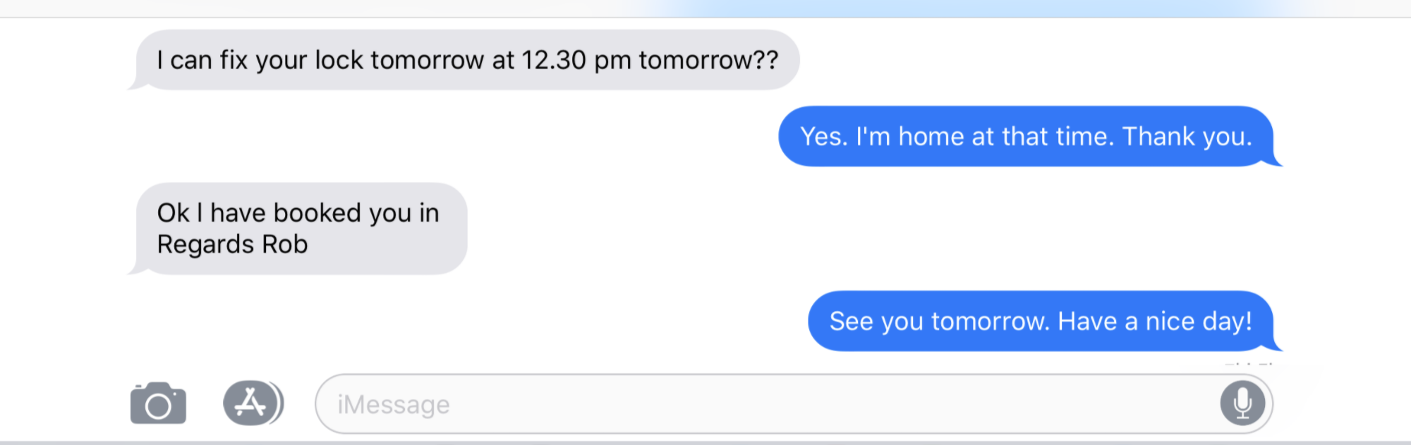 메일을 보낸 뒤 업자에게 문자가 왔었어요. 아주 간단하고 짧은 대화로 예약이 되었죠.