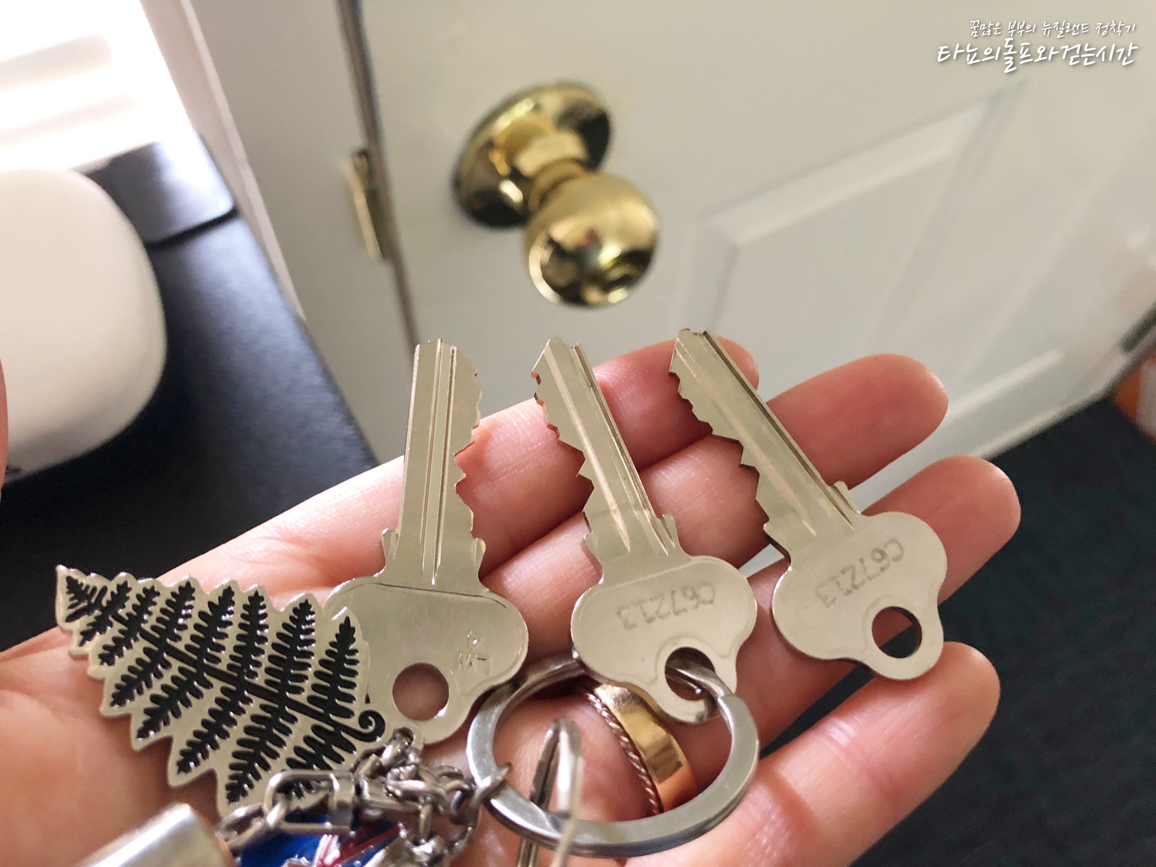 짜잔, 20분 정도 걸린 것 같아요. 문고리를 새 것으로 갈고 열쇠도 3개나 받았답니다. 원래는 딱 하나만 주는거라고 아저씨가 그러셨어요. 하나는 세입자에게 주고 하나는 부동산 에이전트에게 주는 것이 일반적인데 특별히 남편 주라고 하나 더 주는 거라고 하셨죠. 아저씨는 예전에 홈스테이 학생으로 한국인을 받은 적이 있었는데 그 학생의 이름과 저희 신랑의 이름이 똑같아서 기념으로 주는 거라고 하셨죠 ^^ 그럼 하나는 어떻게 더 얻었을까요?