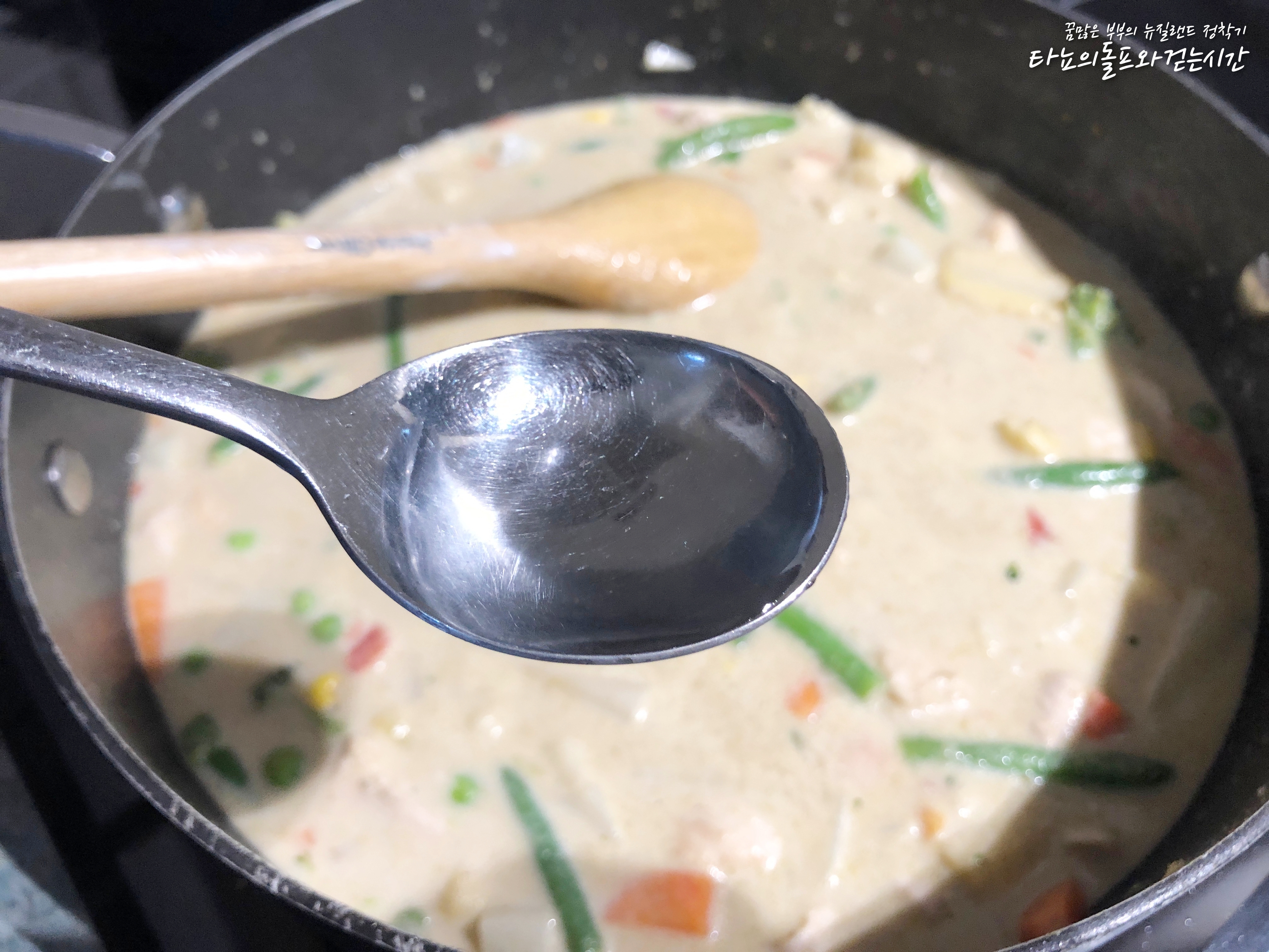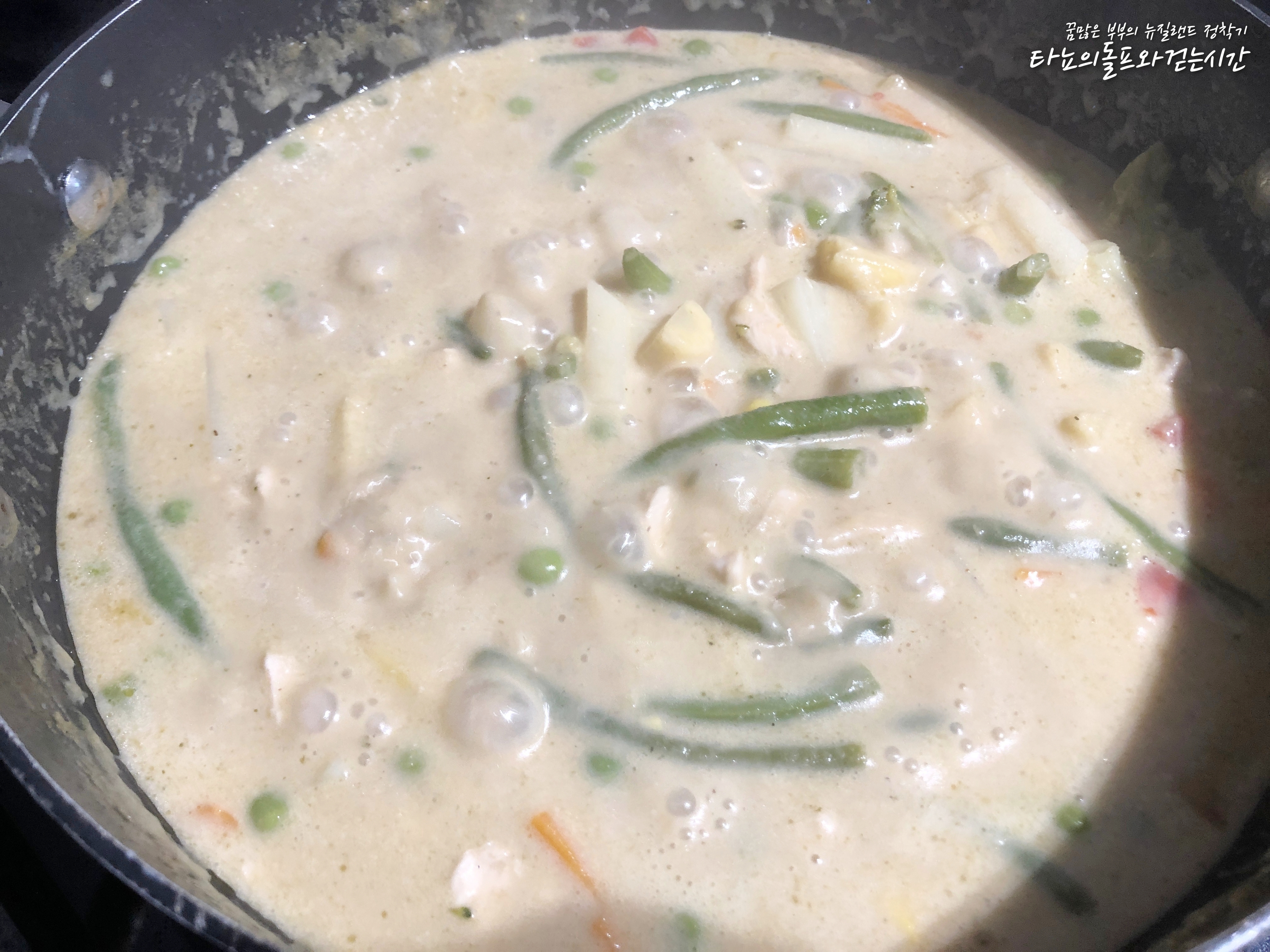 저는 야채가 많이 들어간게 좋아서 듬뿍 넣었는데요. 여러분들은 취향에 맞게 잘 조절하시길 바라요. 처음에 그린커리를 만들 때는 이름처럼 진짜 초록빛이 날 줄 알았답니다. 생각보다 그린커리는 녹색이 아니더라고요^^ 아주 살짝 비치는 정도?