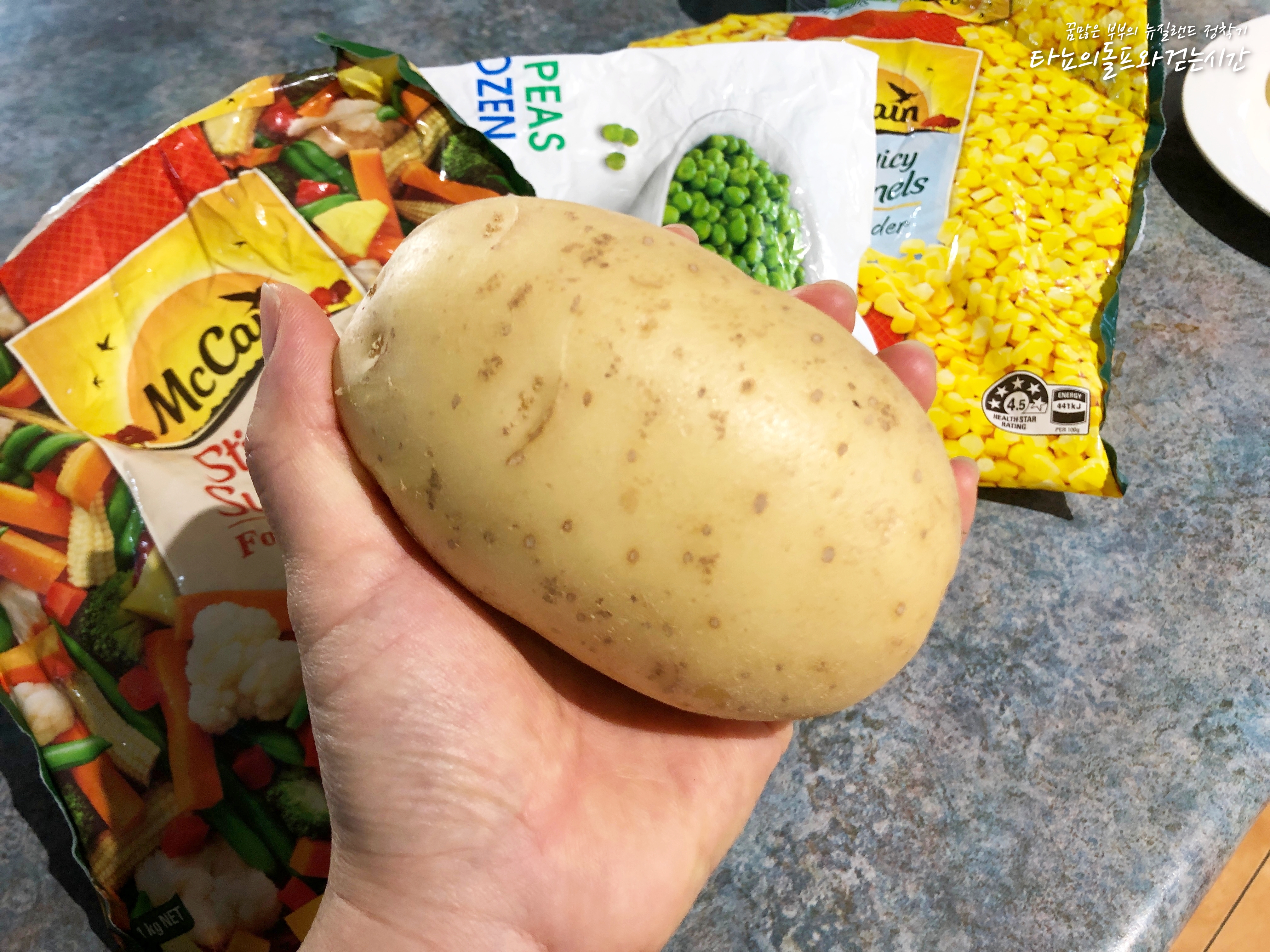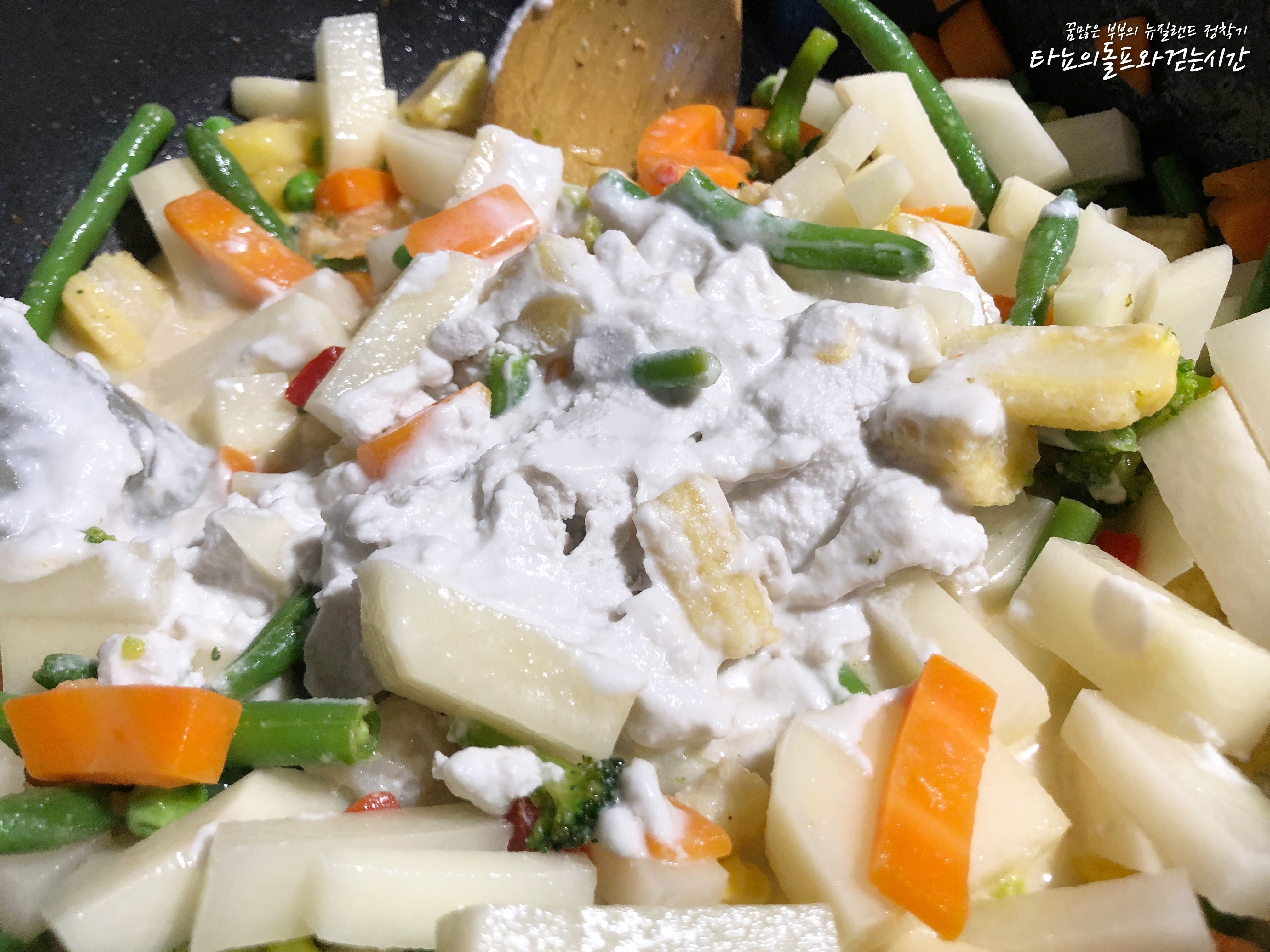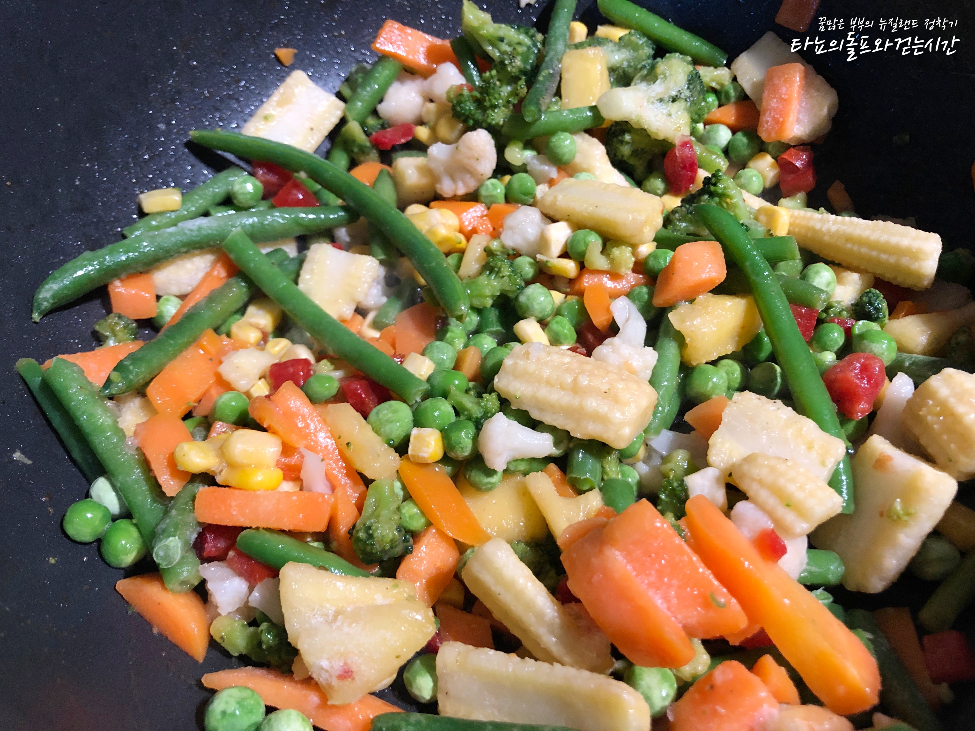 집에 있는 것이 냉동야채믹스 뿐이라서 감자 외에는 모두 냉동야채를 사용했어요. 제가 사용한 냉동야채 믹스에는 브로콜리, 콜리플라워, 당근, 어린 옥수수, 완두콩, 옥수수, 파프리카, 빈, 파인애플 등이 들어가 있었어요. 뉴질랜드는 워낙 냉동야채 종류가 다양하게 잘 나오는 편이라 볶음밥을 하거나 카레를 끓일 때도 종종 사용하고 있답니다. 스테이크를 먹을 때 볶아서 곁들여도 아주 멋진 반찬이 되지요. 특히 요즘처럼 야채값이 금값인 겨울에는 더욱 애정하는 제품입니다.